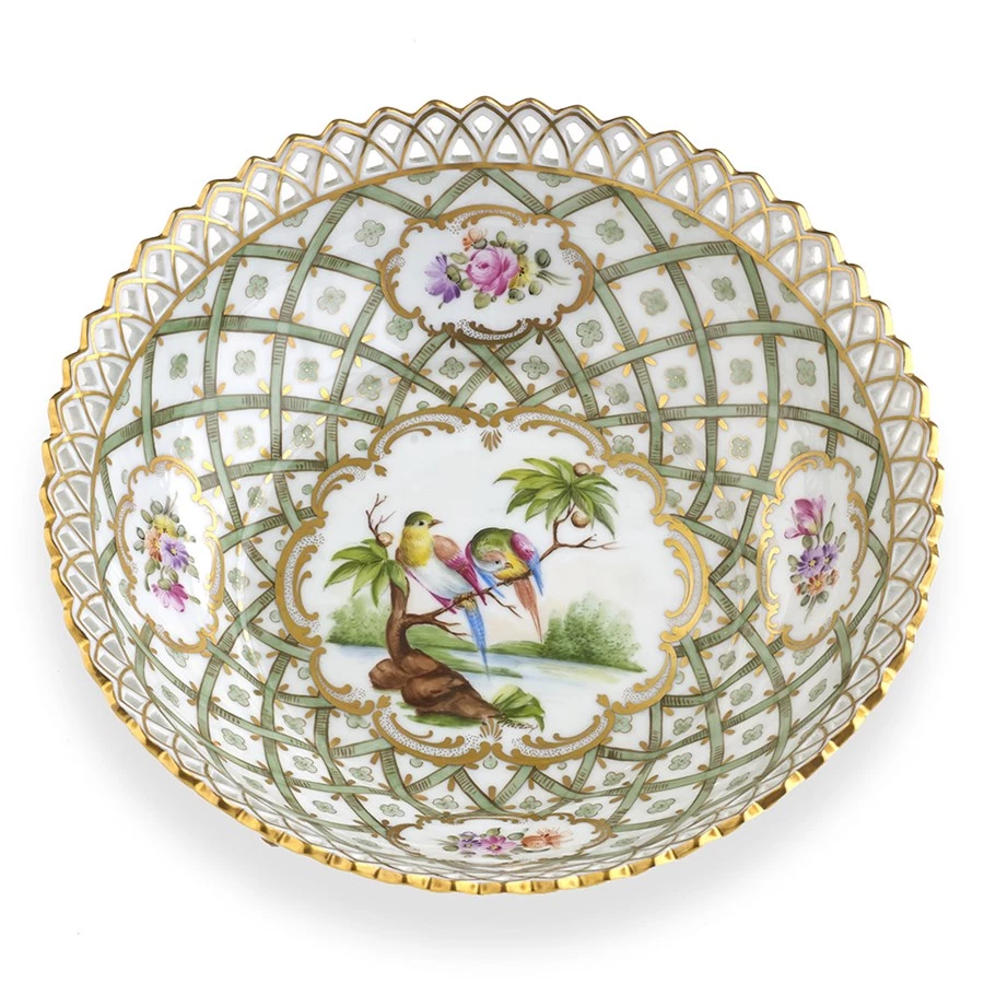 Gorgeous pierced, porcelain footed bowl handmade in Dresden with exquisite Chinosierie style. Features gold accents and handpainted vivid florals in the center with a traditional colorful Chinoiserie bird. Handmade in Germany. Exclusively at Scully & Scully.