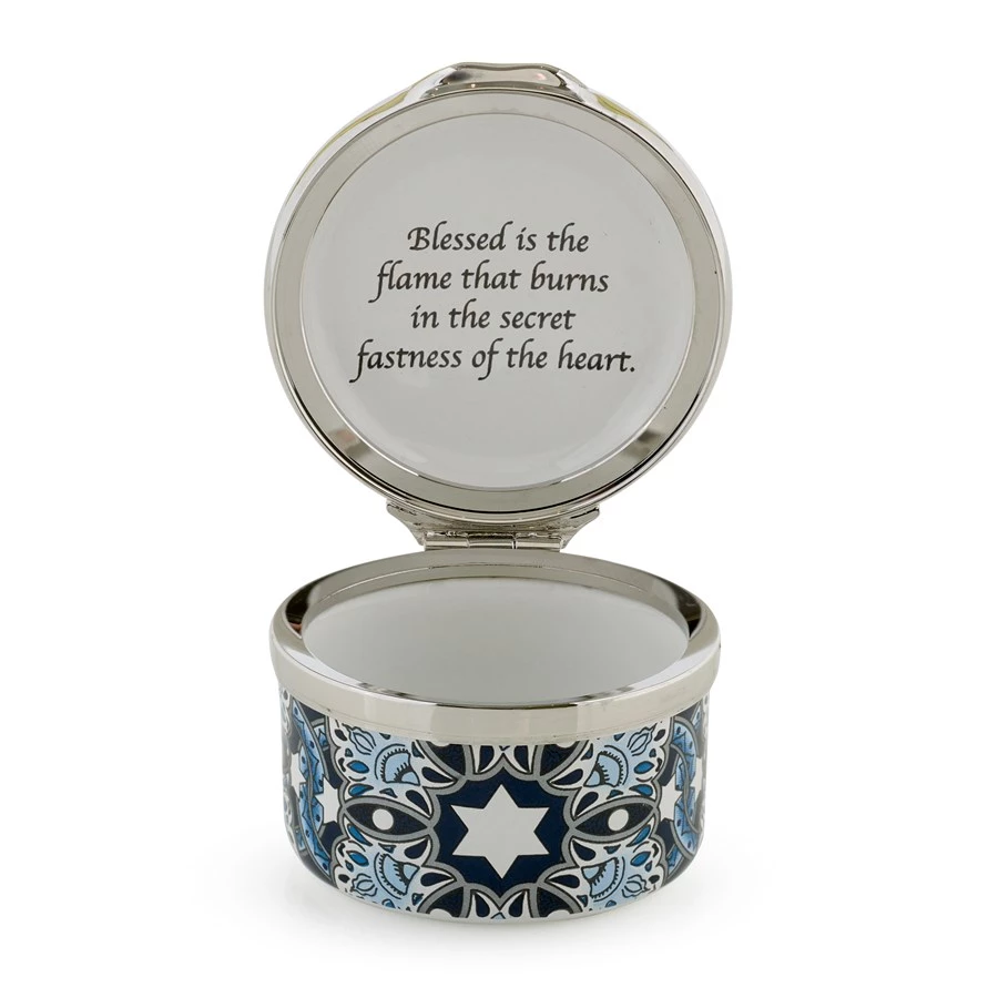 “Blessed is the flame that burns in the secret fastness of the heart.” Designed by Scully & Scully and exclusively ours. From England, handmade and hand-enameled – the same techniques used by the original 18th-century artisans.