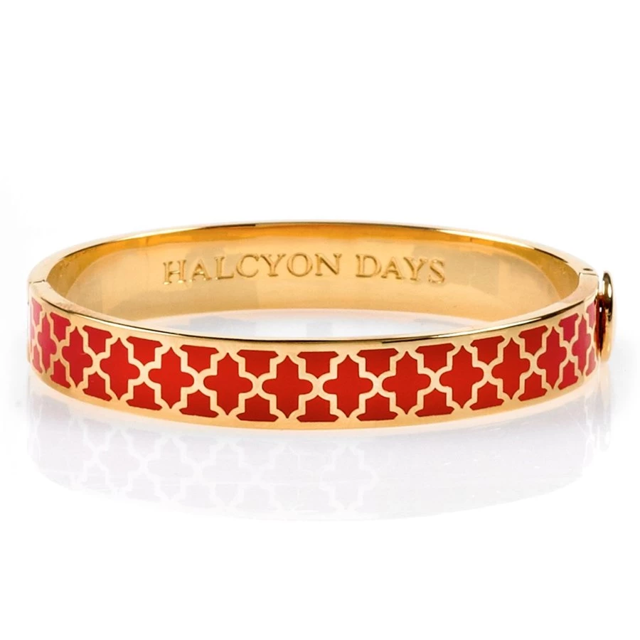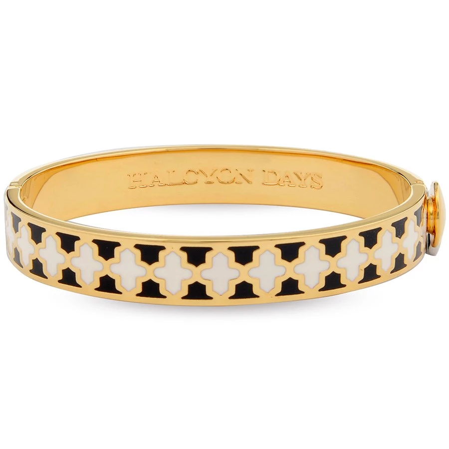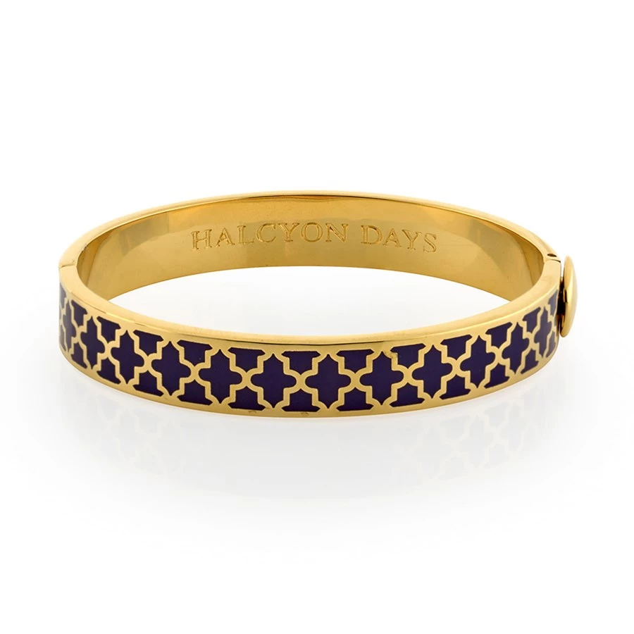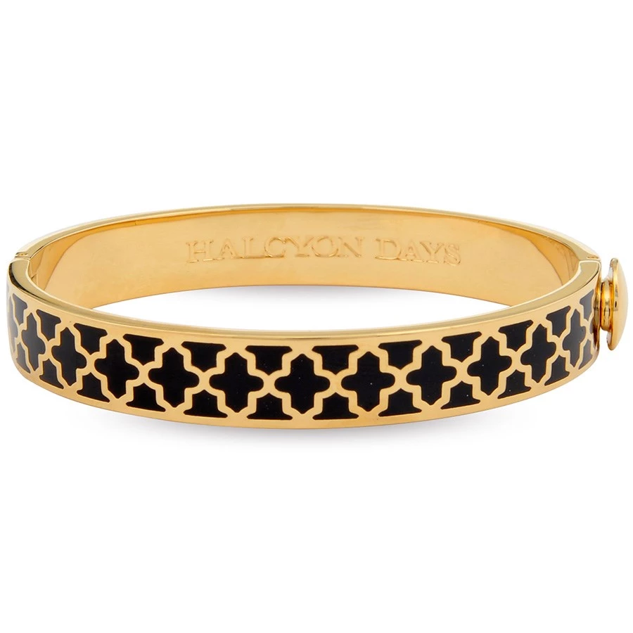 The Agama enamel hinged bangle is easy to match, feminine to wear and the perfect accessory for any occasion, either as a single item or stacked with other bangles. The timeless, contemporary design is finished in 18 karat gold plate and features the Halcyon Days branding on the inside. It is available in a selection of vibrant and classic colors. Hand-enameled in England.