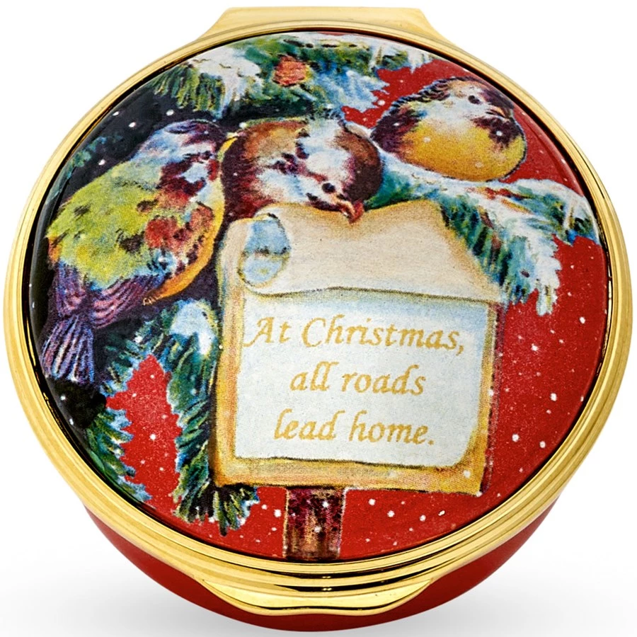 Enjoy the traditional snowy scene of robins in a fir tree surrounding a sign reading “At Christmas All Roads Lead Home.” The reassuring quality and heart-warming sentiment of a Halcyon Days Christmas box makes a perfect gift or home decoration. Handcrafted in England, this is a beautiful example of British craftsmanship. Can be personalized inside base: please allow eight weeks.