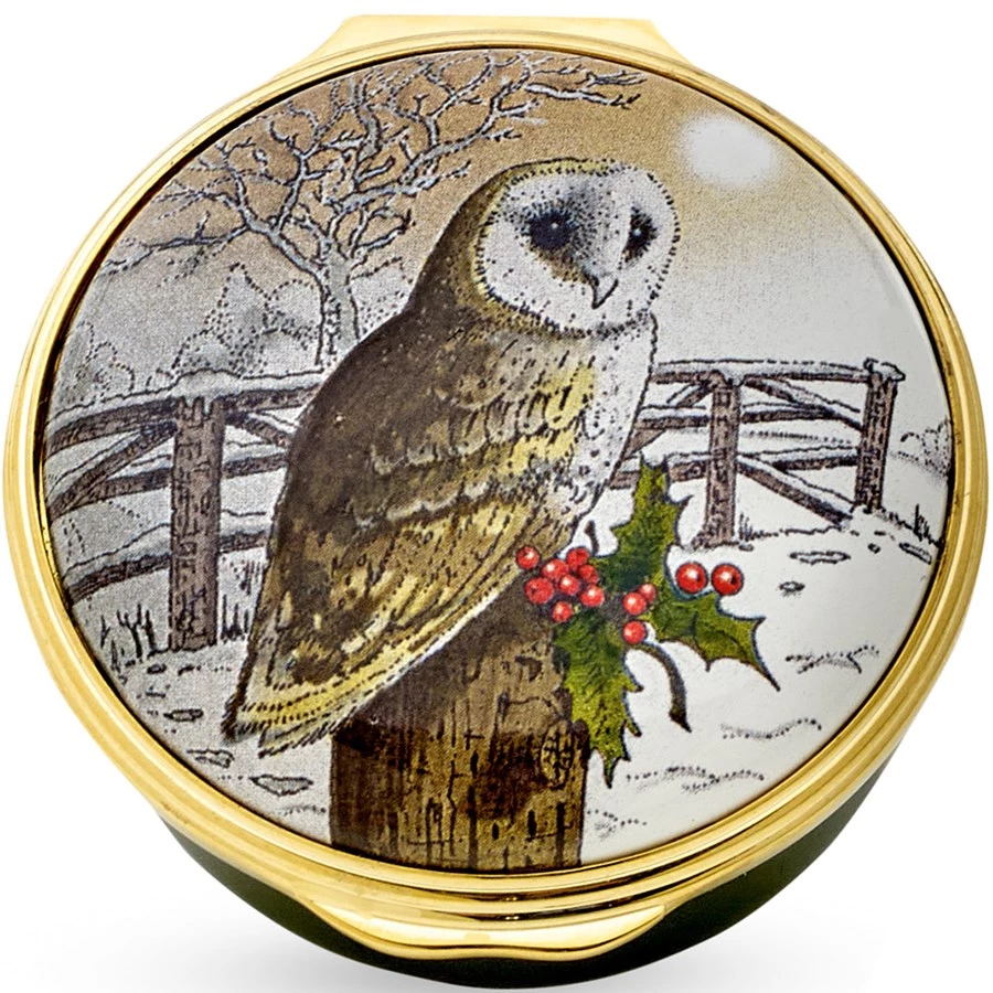 A beautiful keepsake collectible box features an austere owl against a snowy festive backdrop. Opening up the traditional box reveals the cheerful message handpainted inside the lid: “Woo Hoo! It’s Christmas!” From England, handmade and hand-enameled with 24k goldplated fittings – the same techniques used by the original 18th-century artisans. Can be personalized inside base: please allow eight weeks.