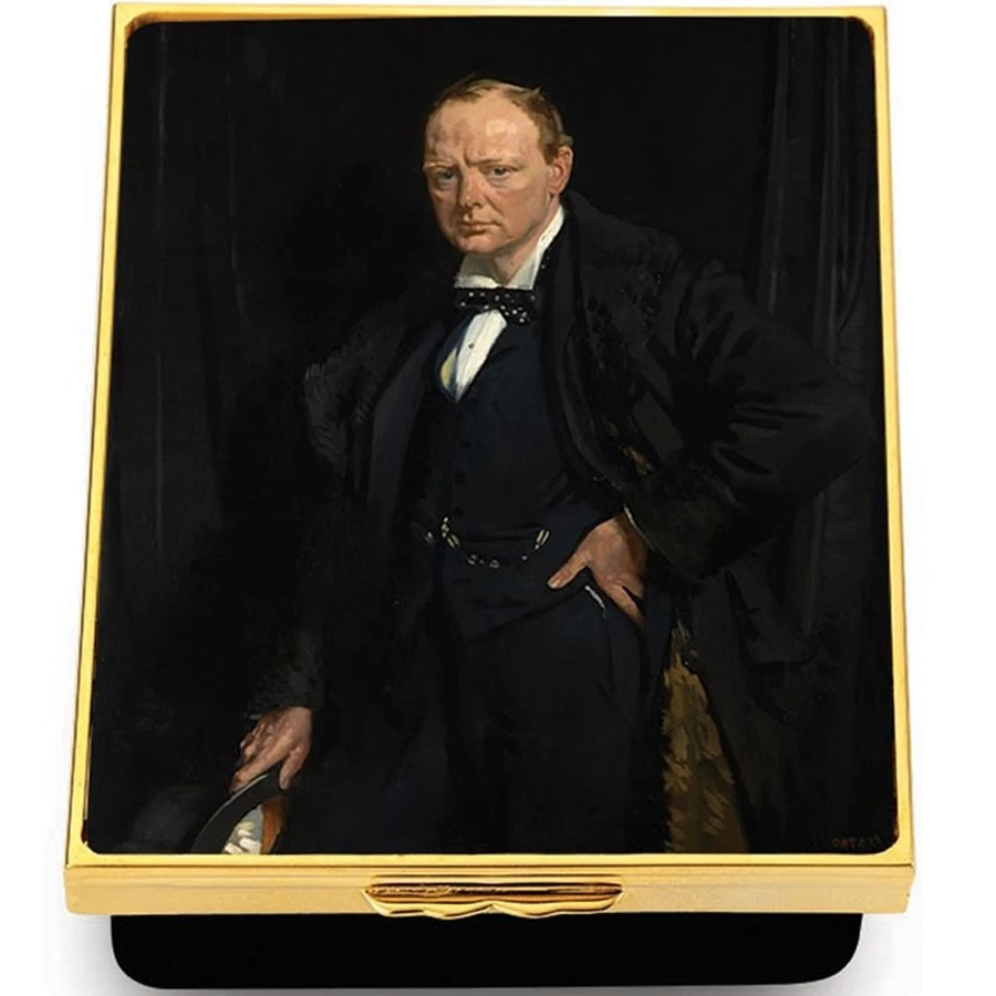 To mark the fiftieth anniversary of Sir Winston Churchill’s death, Halcyon Days collaborated with the National Portrait Gallery to create this limited edition enamel box. The portrait on the lid of the box was painted in 1916 by Sir William Newenham Montague Orpen. Perhaps because of the recent disaster at Gallipoli, Churchill’s expression seems deeply troubled, making this portrait quite unique in capturing his profound, personal sense of humanity, as well as his public role as a statesman. A handsome example of great British craftsmanship, handpainted in England using traditional techniques.