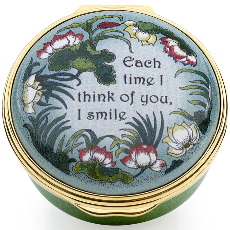 “Each time I think of you, I smile.” A beautiful keepsake collectible box with a flower painted inside the lid. From England, handmade and hand-enameled with 24k goldplated fittings – the same techniques used by the original 18th-century artisans. Exclusively at Scully & Scully. Can be personalized inside base: please allow eight weeks.
