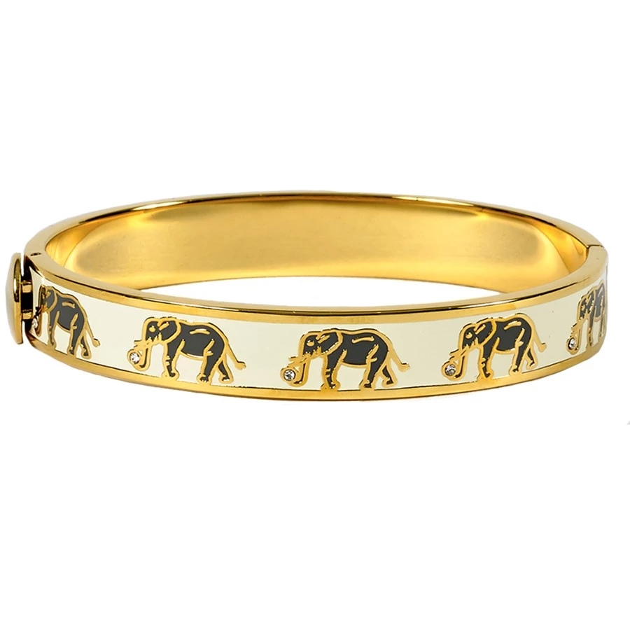 Elephant hinged bangles are fabulous additions to your jewelry collection. They stack beautifully with other Halcyon Days bangles and are sure to be a favorite! Finished with 18k gold plating, the enamel bases have been decorated with colored elephants and embedded with sparkling crystal detailing.