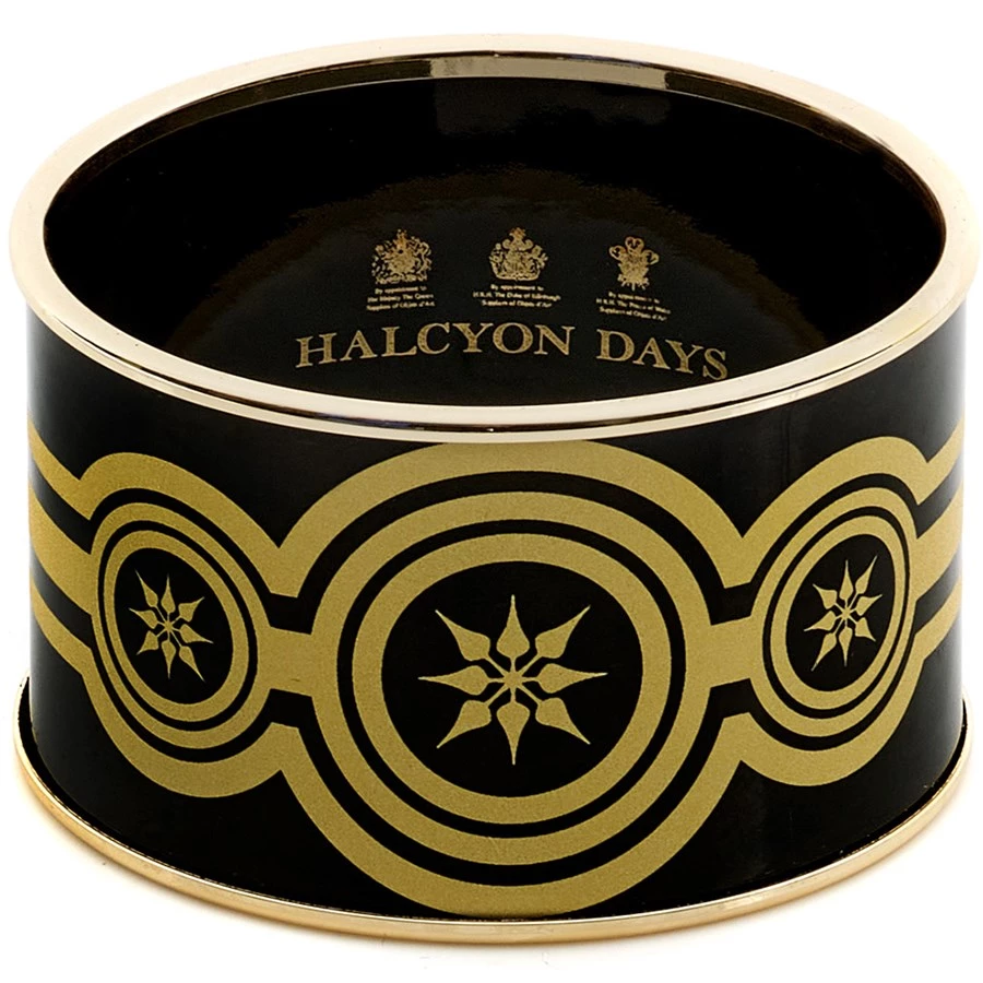 Beautiful and dramatic as a fashion statement, a beautiful floral mosaic is handpainted in gold over this elegant black 1½” wide bangle. Handpainted, hand-enameled cuff bangles from Halcyon Days in England with 18k goldplated rims.