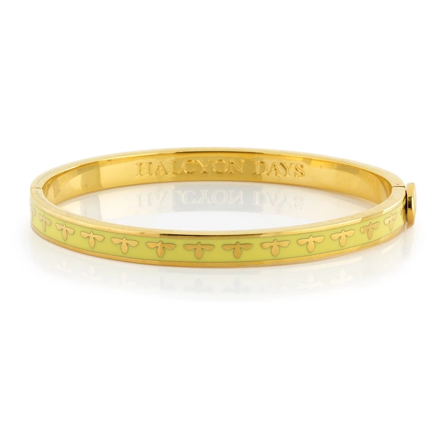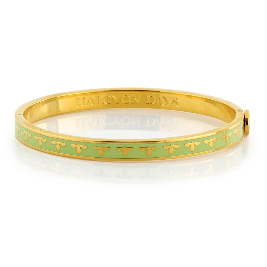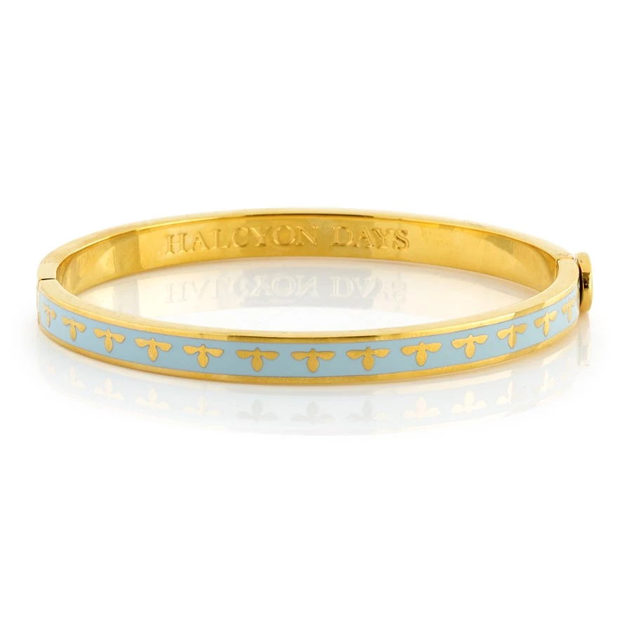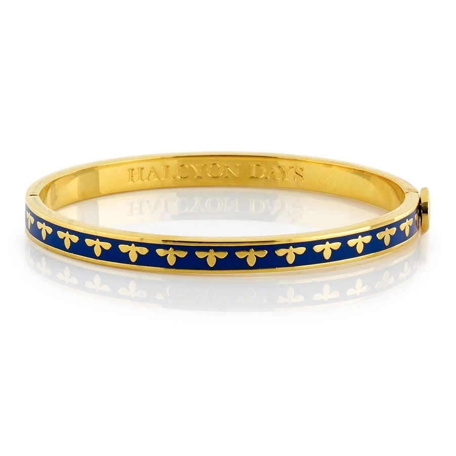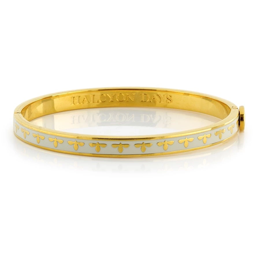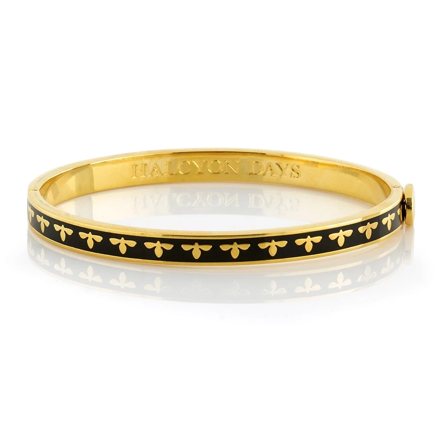 Add a touch of animal inspiration to your daily style with the Hinged Skinny Bee Bangle by Halcyon Days. The gold-plated bangle features honey bee silouettes and a button-like clasp for secure hold. Simply wear alone or stack with others. Handmade and hand-enameled with 18k gold.