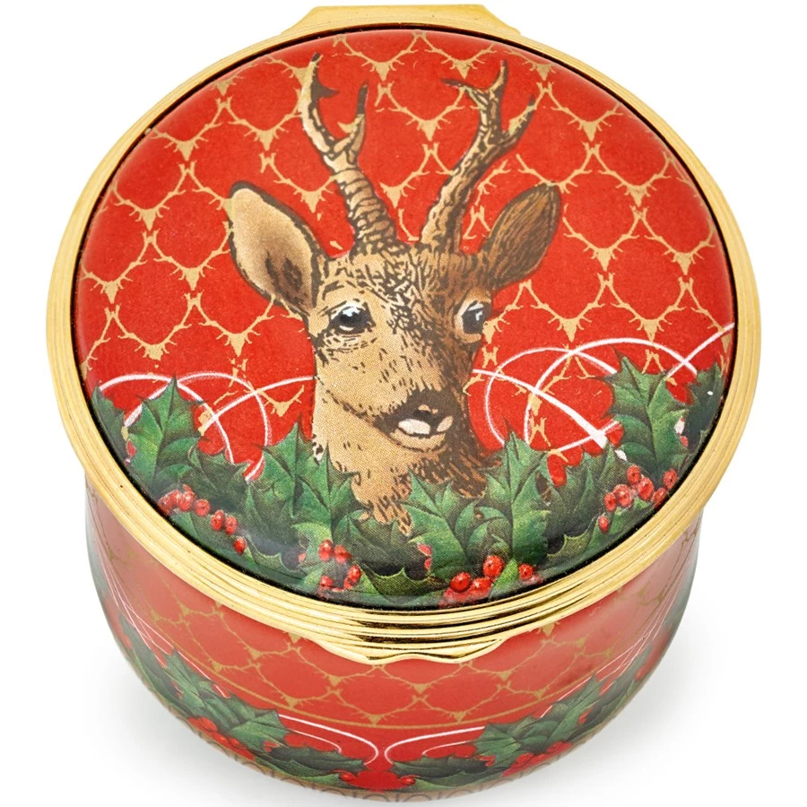 This holiday musical box plays a segment of the beloved Christmas song and features the Antler Trellis & Stag Design. Handmade and hand-enameled with 24k goldplated fittings by Halcyon Days in England.