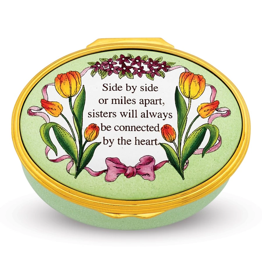 Commissioned by Scully & Scully and exclusively ours. Text reads: “Side by side or miles apart, sisters will always be connected by the heart.” Two hearts and ribbon painted inside lid. Can be personalized inside base: please allow eight weeks.