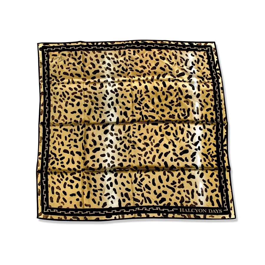 Bright and beautiful, this is an exquisite 100% Italian silk scarf with animal print design against a bold black background. It features a roaringly distinguished design drawn by close Halcyon Days collaborator and New York based illustrator Tug Rice.