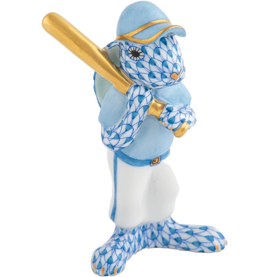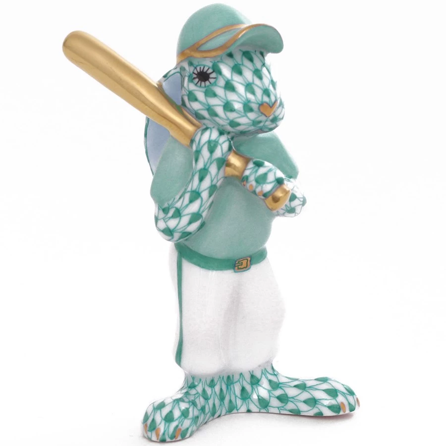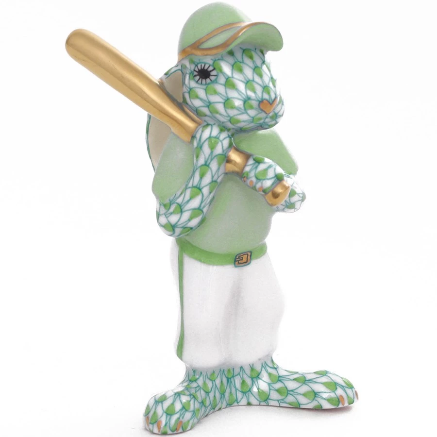 Batter up! Introducing the Herend Baseball Bunny, adorned in the traditional jersey and cap with the accompanying bat. Handmade and handpainted porcelain from Hungary, enhanced with 24k gold accents.