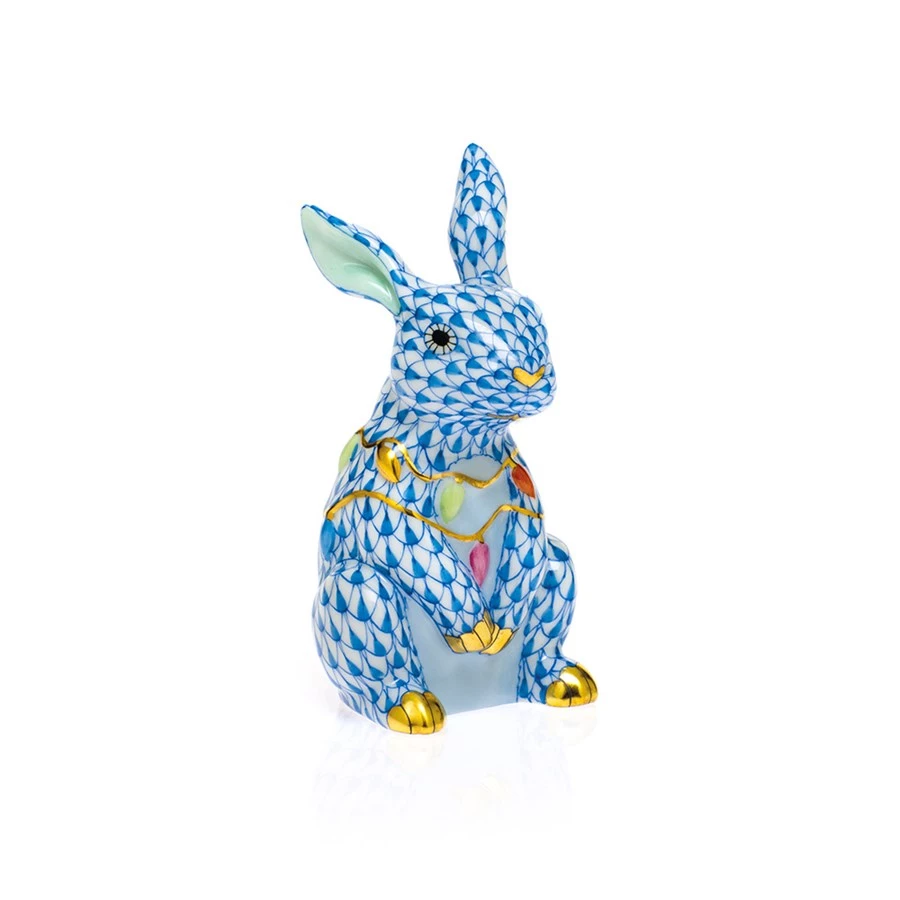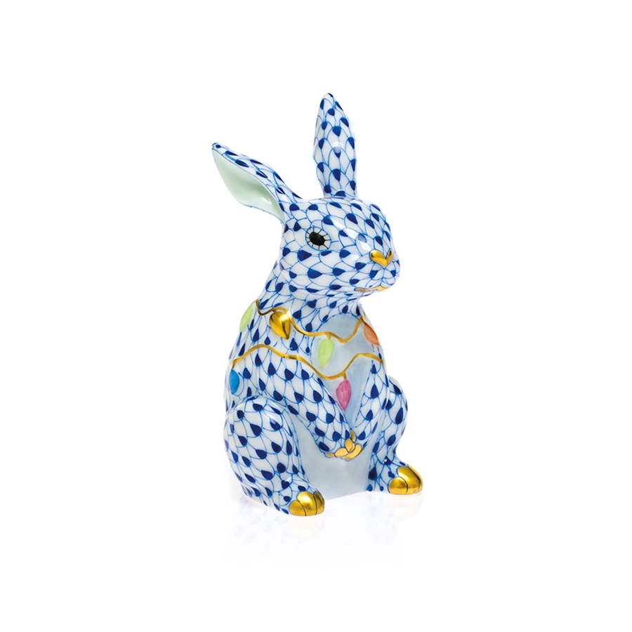 A humorous and whimsical addition to any collection, Bunny with Christmas Lights is a funny festive treat. Herend porcelain from Hungary, handmade and handpainted with 24K gold accents.