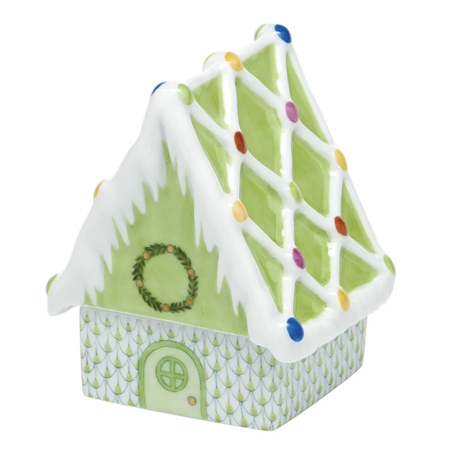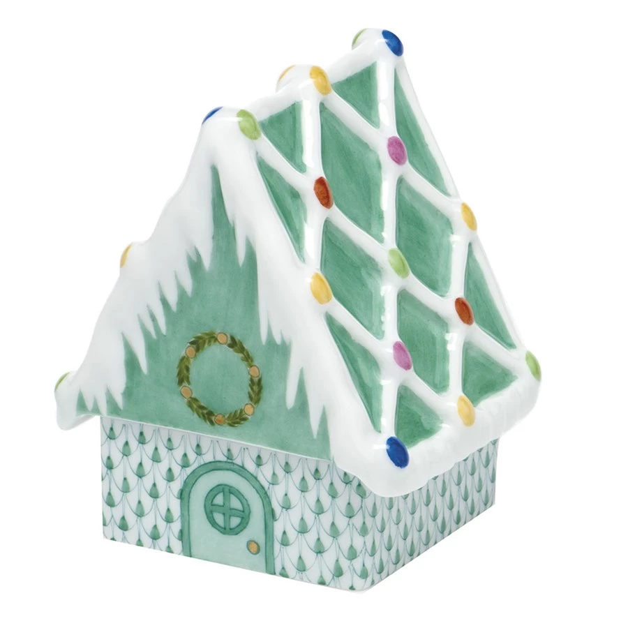 In 1874, a Herend artist picked up his tools to try to mimic a Chinese plate’s fish scale design and the illustrious fishnet pattern was born. This charming gingerbread house opens, perfect for hiding a sweet treat inside. Porcelain from Hungary, handmade and handpainted with 24k gold accents.Â