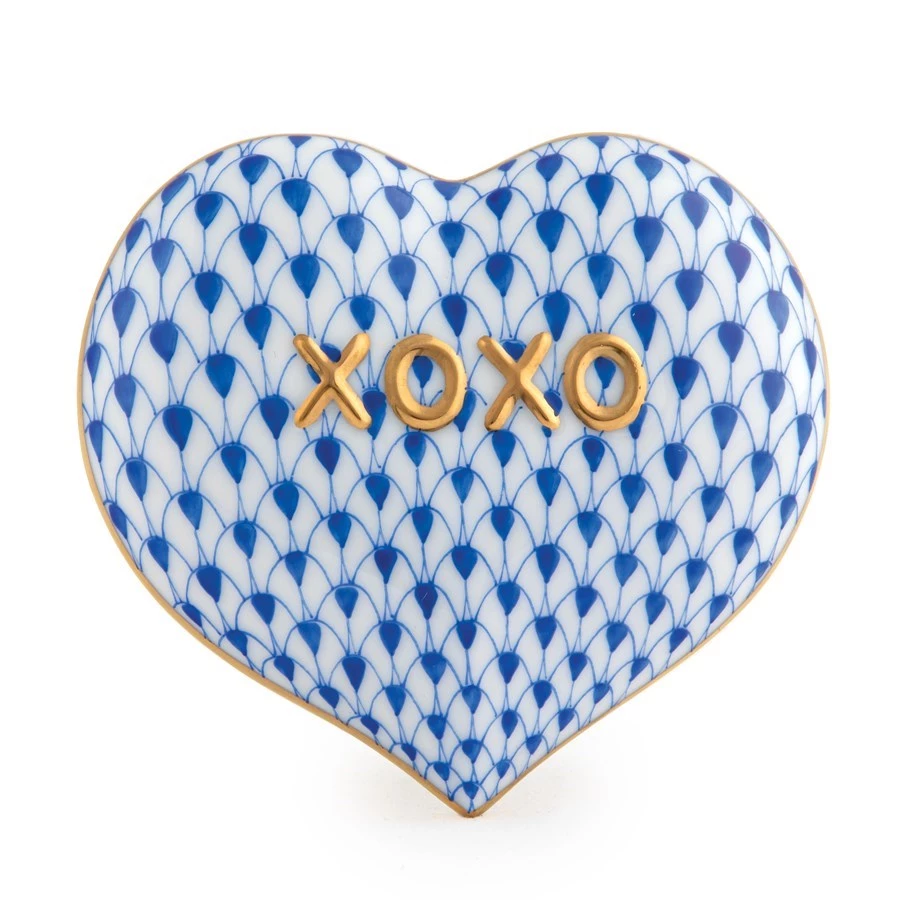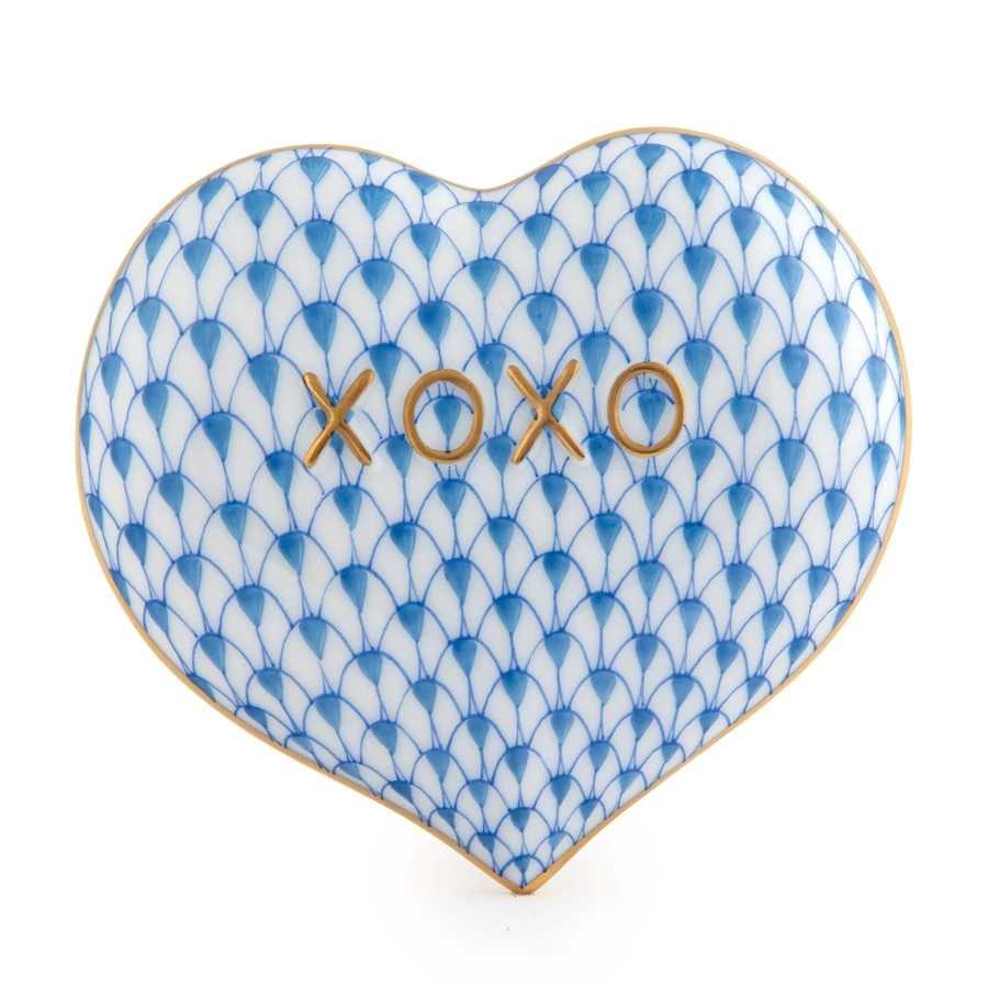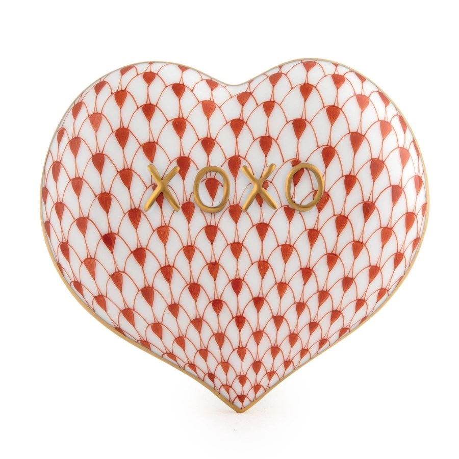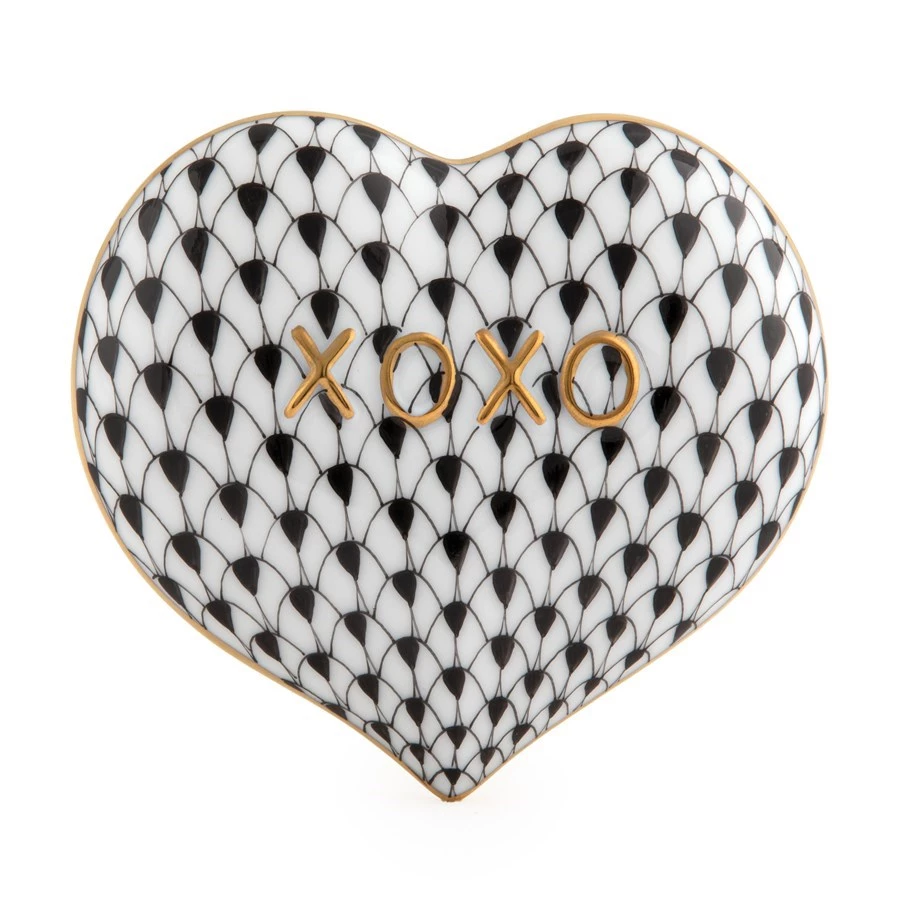 A lovely valentine’s heart is decorated with adorable “hugs and kisses” x’s and o’s. Herend porcelain from Hungary, handmade and handpainted with 24K gold accents.