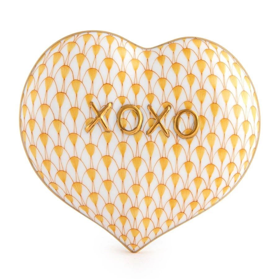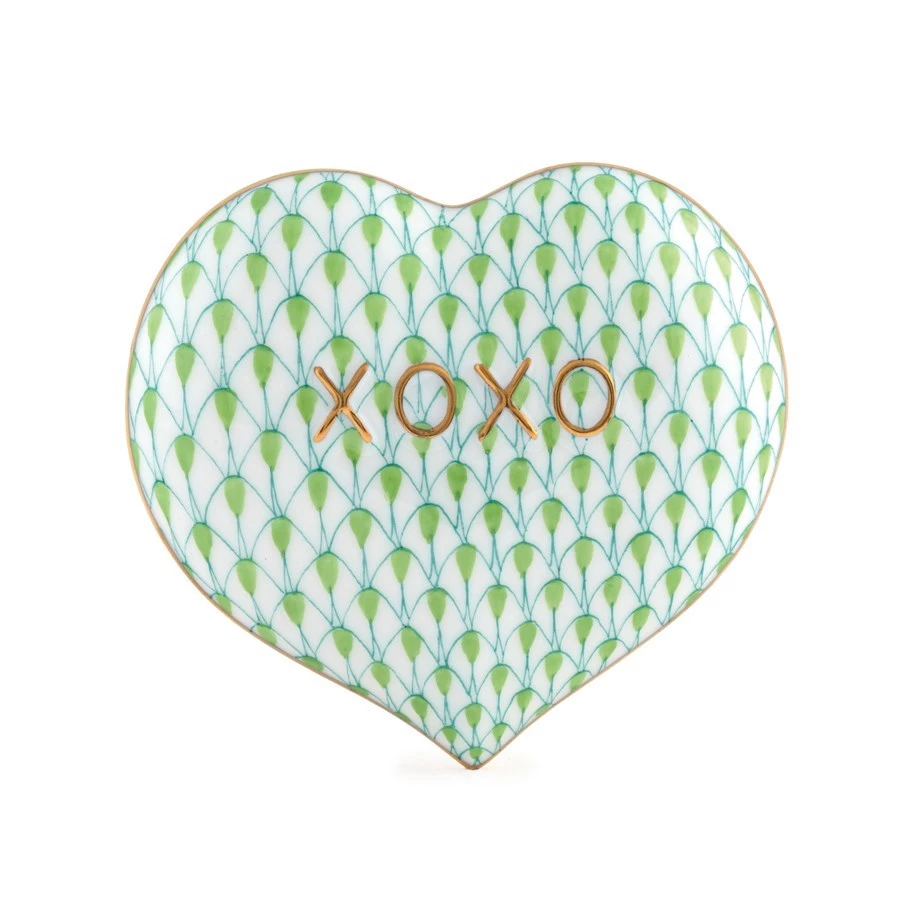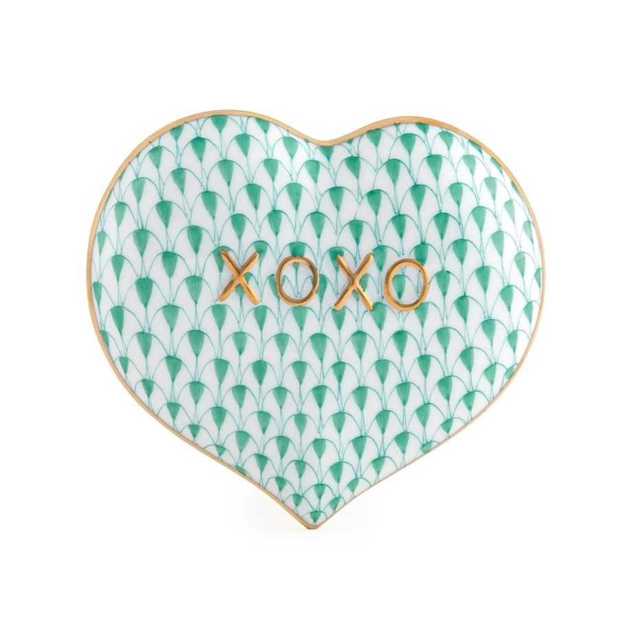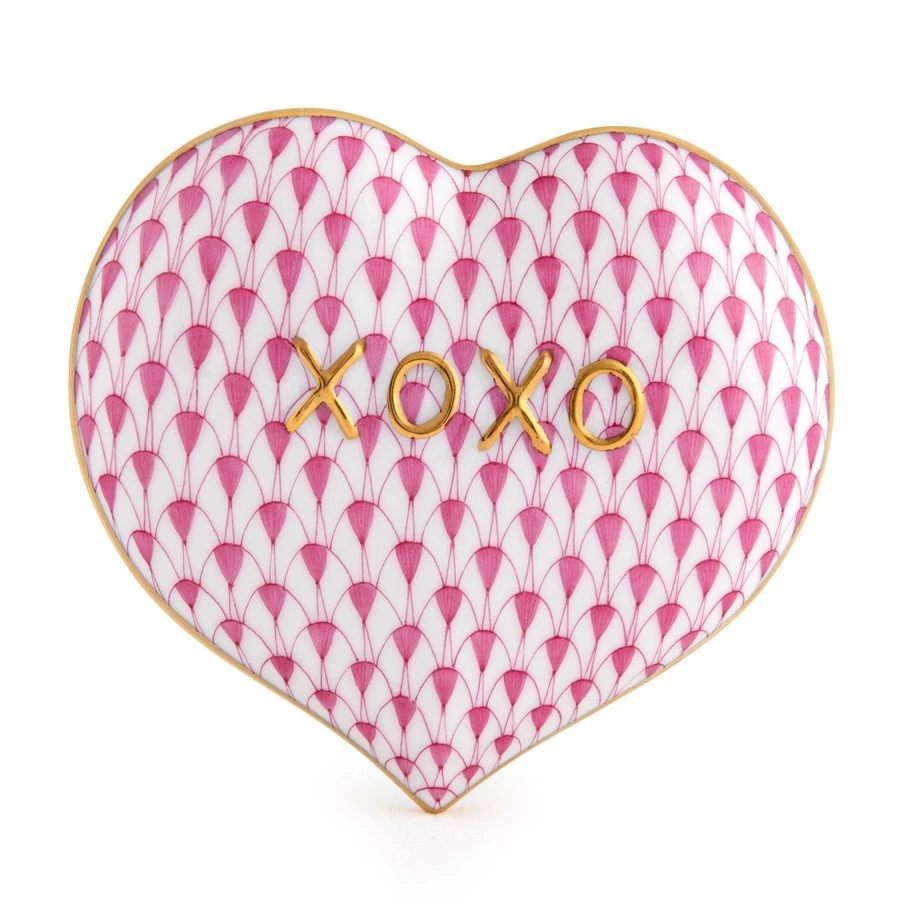 A lovely valentine’s heart is decorated with adorable “hugs and kisses” x’s and o’s. Herend porcelain from Hungary, handmade and handpainted with 24K gold accents.