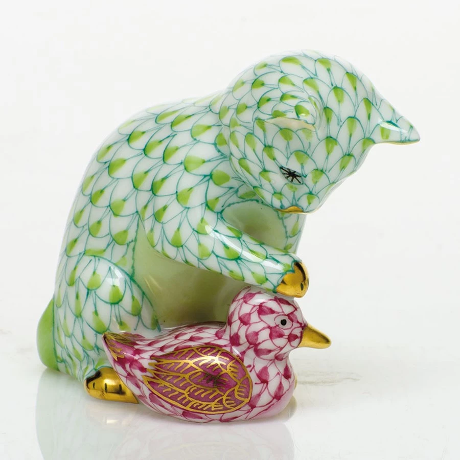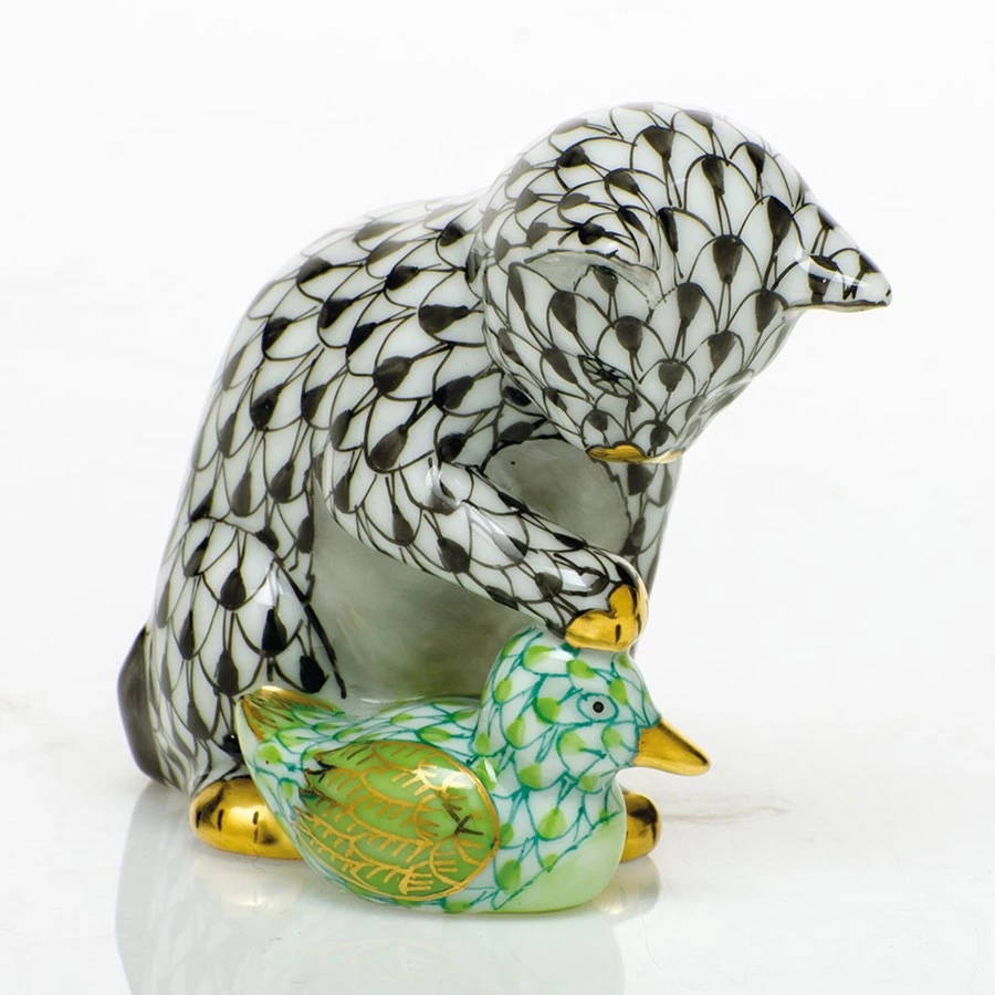 Another beautiful unexpected animal friendship from Herend. Both Kitten & Duckling feature the illustrious fishnet design, first created in 1874 when a Herend artist picked up his tools to try to mimic a Chinese plate’s fish scale. Porcelain from Hungary, handmade and handpainted with 24k gold accents.