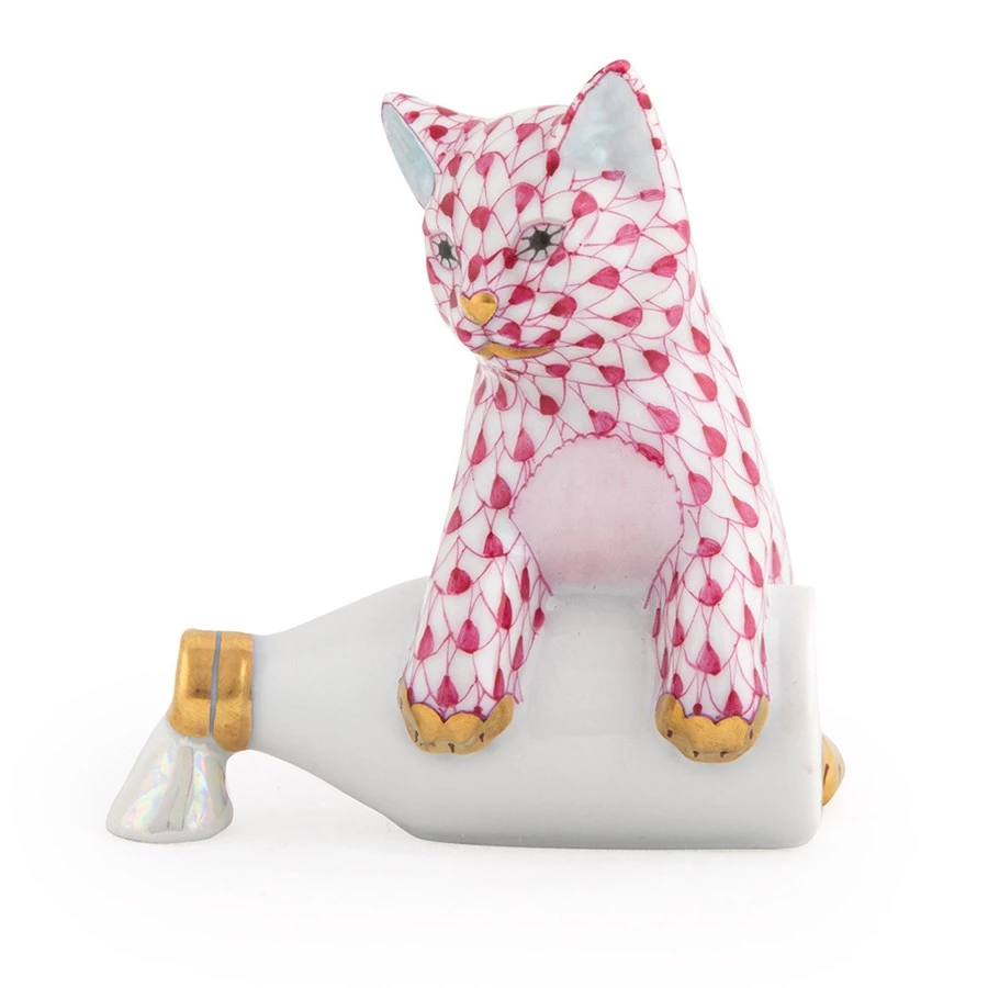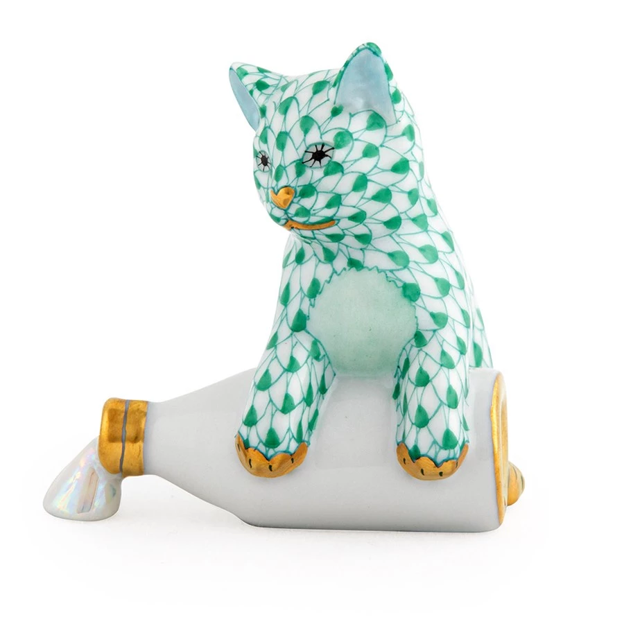 This mischievous kitten spilled the milk! Handmade and handpainted Herend porcelain from Hungary with 24 karat gold accents.