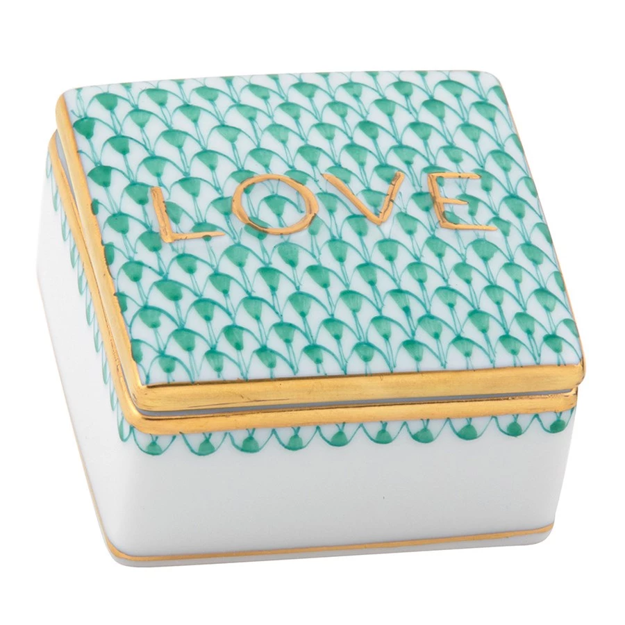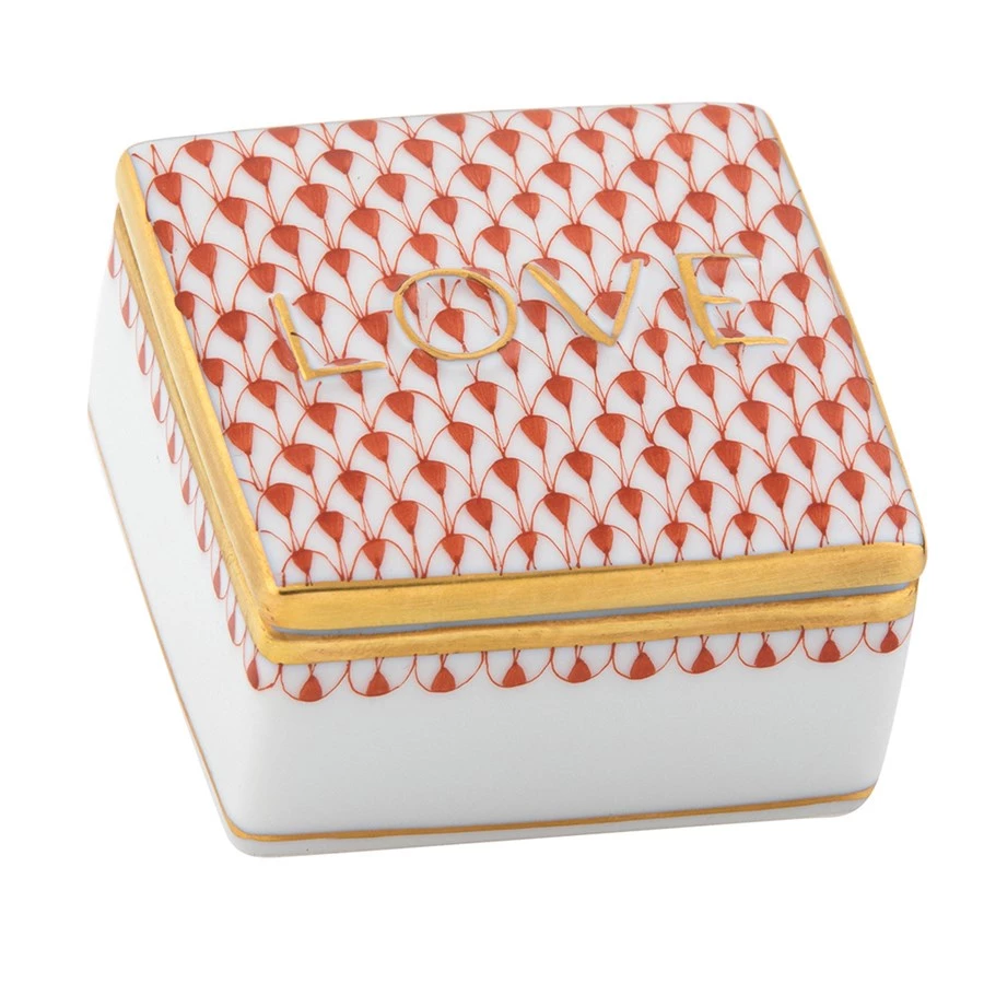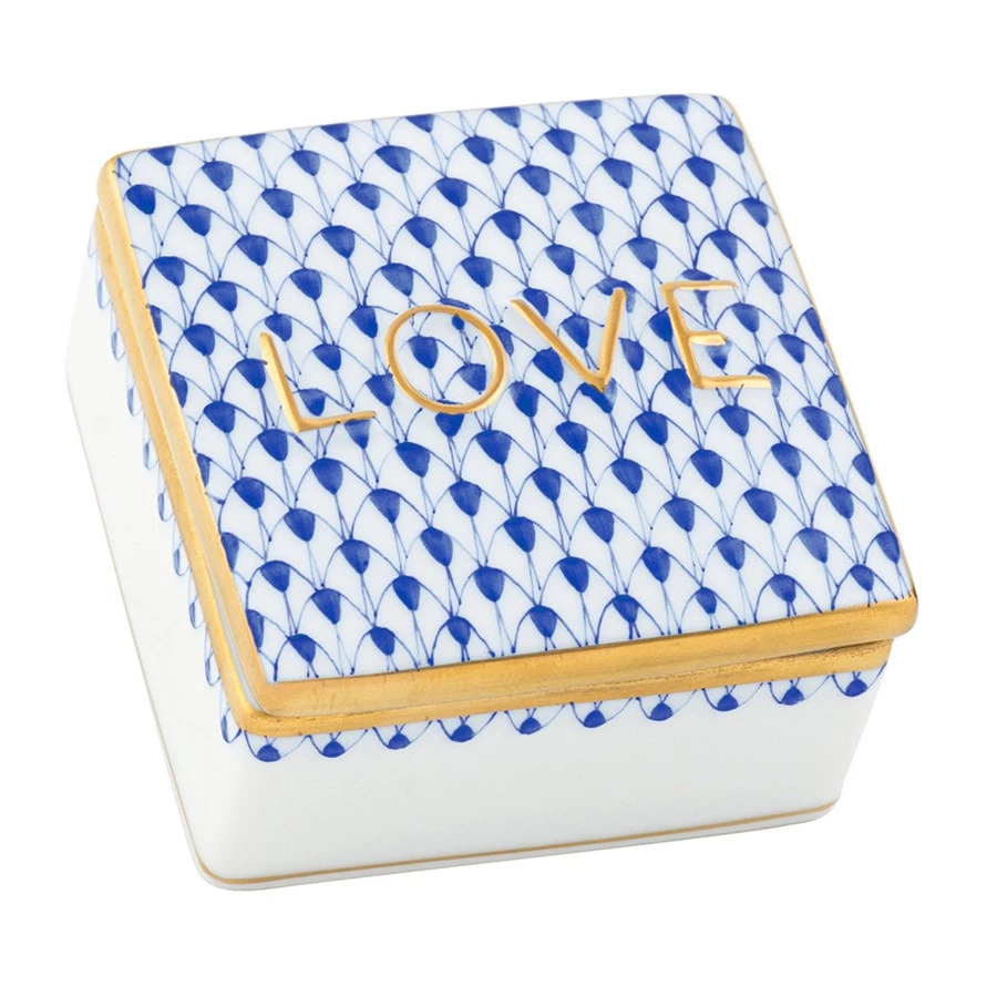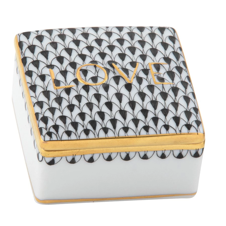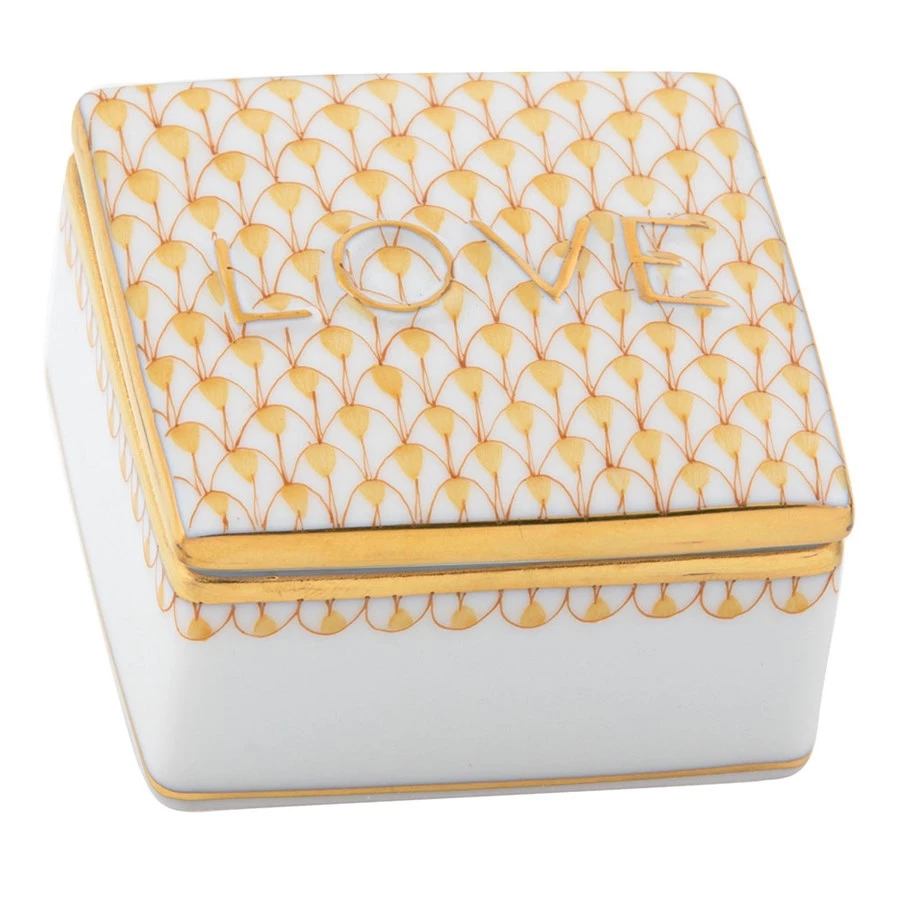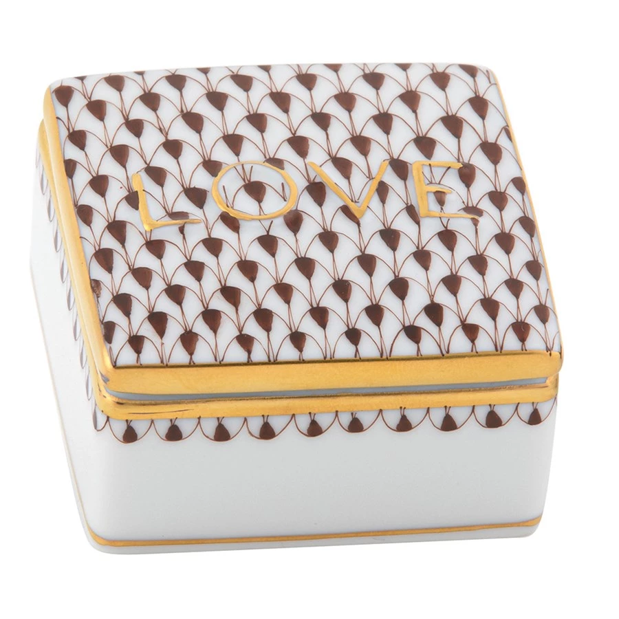 Beautiful handmade porcelain box features the the world-famous Herend fish net motif across the top accented with the raised word LOVE painted in gold. Handmade porcelain from Hungary, handpainted with 24k gold accents.