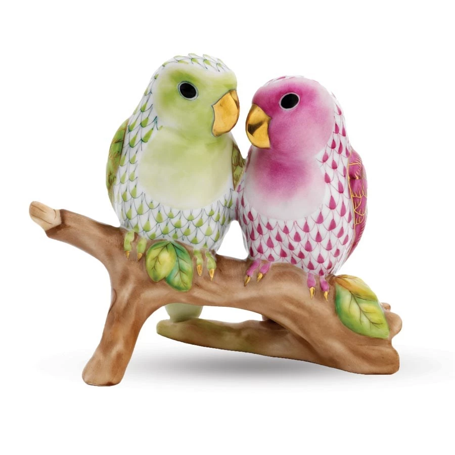 Herend porcelain from Hungary, handmade and handpainted with 24k gold accents. The Key Lime & Raspberry lovebirds are made for and sold exclusively at Scully & Scully.