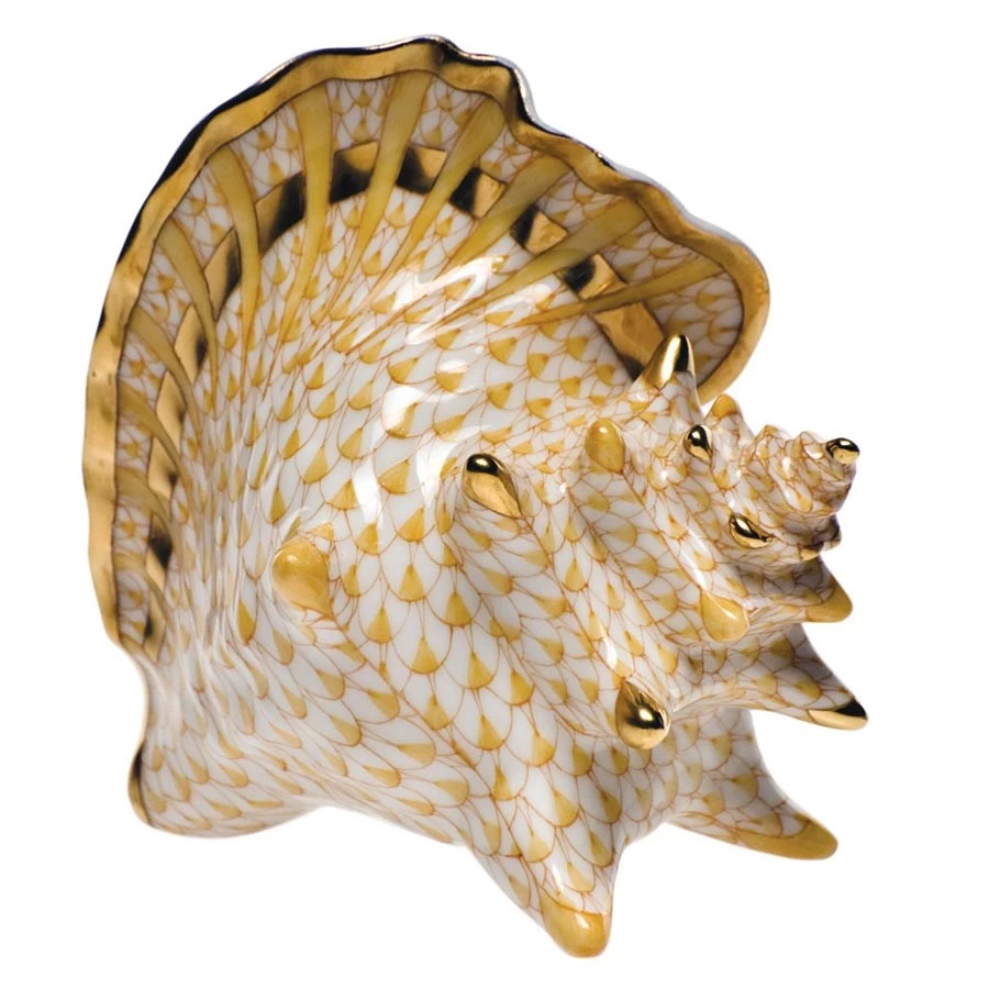 The illustrious fish net pattern is handpainted over porcelain conch shells, accented with gold edging for a fabulous finish. Handmade and handpainted porcelain from Hungary with 24k gold accents.