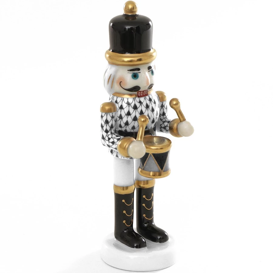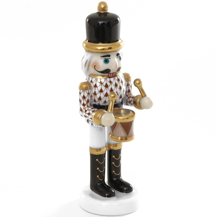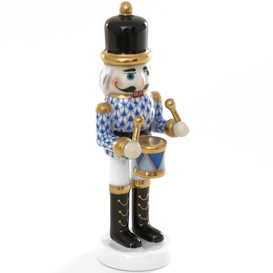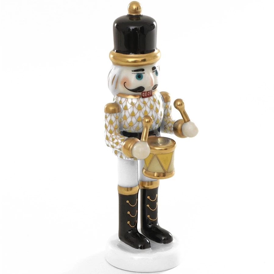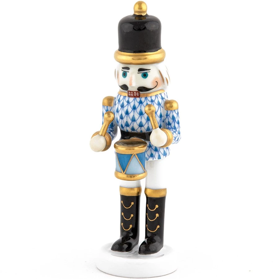 A holiday classic, the Herend porcelain nutcracker comes with his drumsticks raised and ready to play. In 1874, a Herend artist picked up his tools to try to mimic a Chinese plate’s fish scale design, beginning the tradition of the illustrious fishnet pattern. Herend porcelain from Hungary is handmade and handpainted with 24k gold accents.