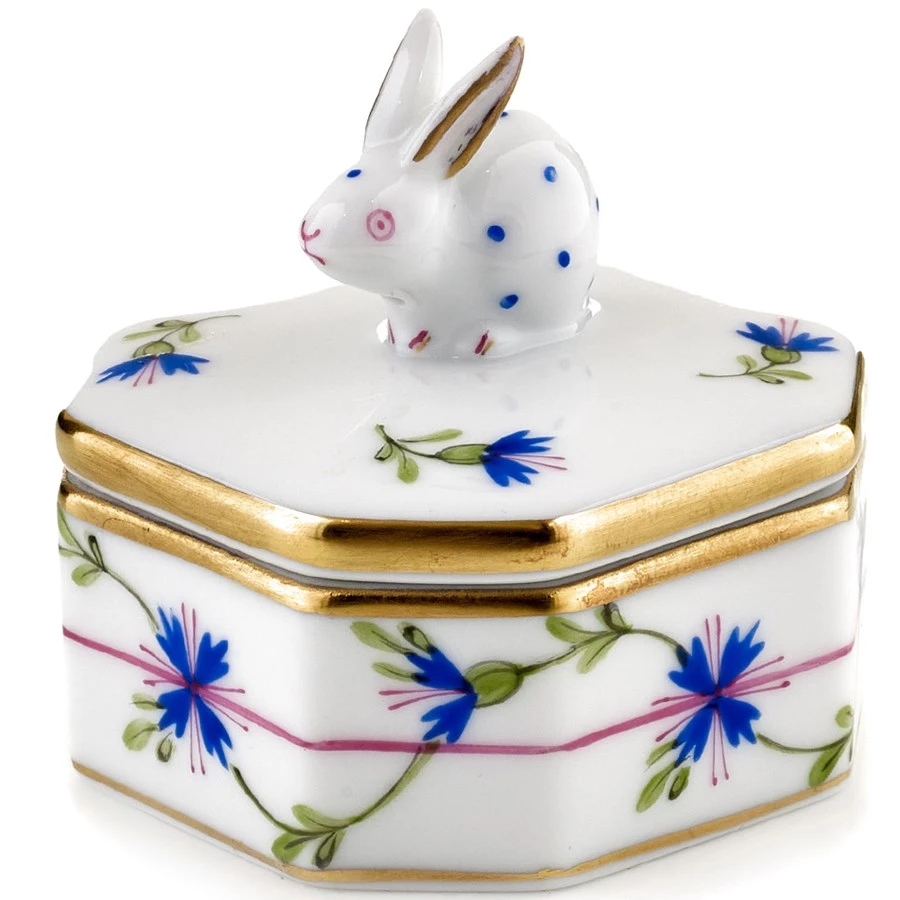 Whismical octagonal petite porcelain box is ideal for a vanity or entryway. The handcrafted Bunny finial helps lift the lid to reveal a small space to store fancies. Handmade porcelain by Herend of Hungary, handpainted with 24k gold accents.