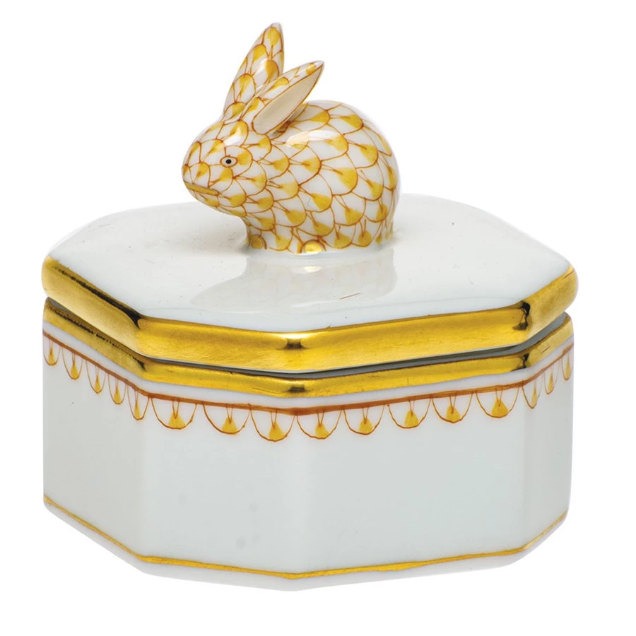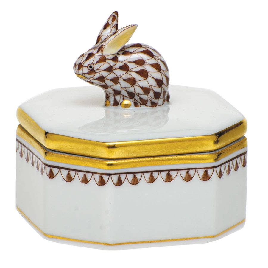 Whismical octagonal petite porcelain box is ideal for a vanity or entryway. The handcrafted Bunny finial helps lift the lid to reveal a small space to store fancies. Handmade porcelain by Herend of Hungary, handpainted with 24k gold accents.
