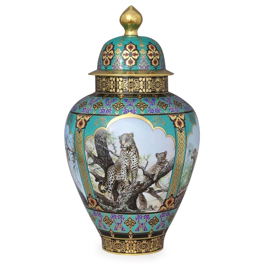 Native to the Arabian Peninsula, between the hilly and mountainous areas of the Negev Desert and the Musandam Peninsula, there are thought to be fewer than 200 Arabian Leopards in the wild. A critically endangered species, Herend master painter Sándor Vida captured faithfully the slightest movement and the color scheme of the animal. The arabesque ornamentation of the vase includes a series of repetitive arabesques sumptuously handpainted in 24k gold. A fitting tribute to this rare and wonderful animal. Handmade and hand-painted in Hungary with 24k gold accents. Limited edition of 25.