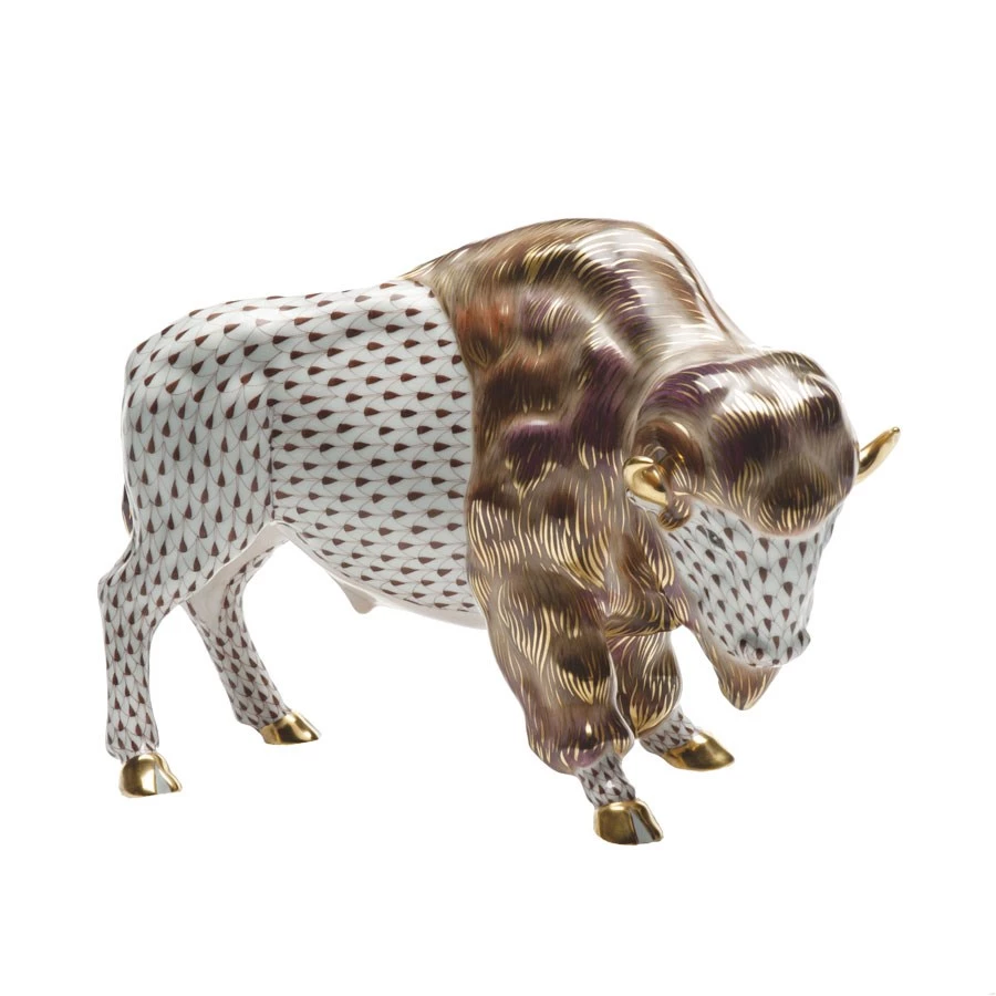 His thick fur makes him impervious to snow and he uses his large head like a snow plow and yet the American bison can achieve speeds of up to 40 mph. Mother Nature may have made him a highly efficient powerhouse but North America’s largest land mammal has always felt more hulking than handsome – until now. The artists at Herend have beautifully captured his virility and strength and covered it all in a mantle of gold accents and dramatic chocolate fishnet. Next breeding season the cows definitely won’t play so hard-to-get! Limited edition of 250.