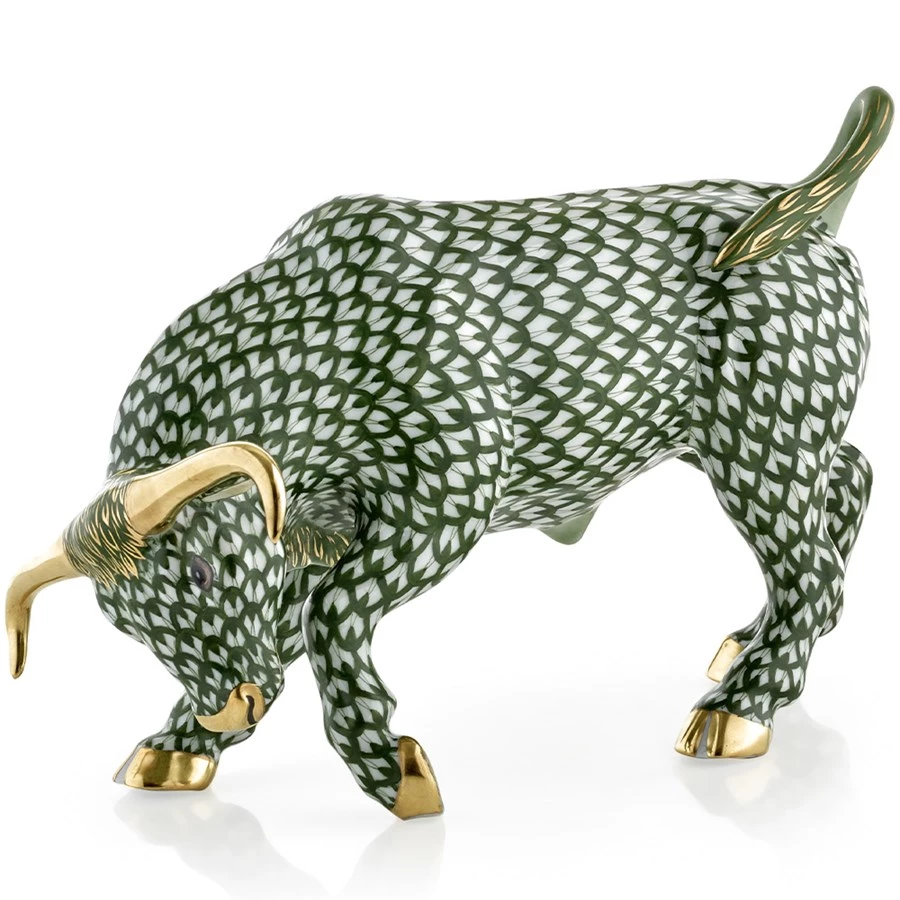 This fierce bull sports a dramatic forest green fishnet coat and famously represents one half of the dynamic movement of financial markets. The artists at Herend accomplish his arresting presence through a heavy, intense brushstroke that gives the bear potent, virile energy. Handmade and handpainted porcelain from Hungary with 24k gold accents. Limited edition of 150.