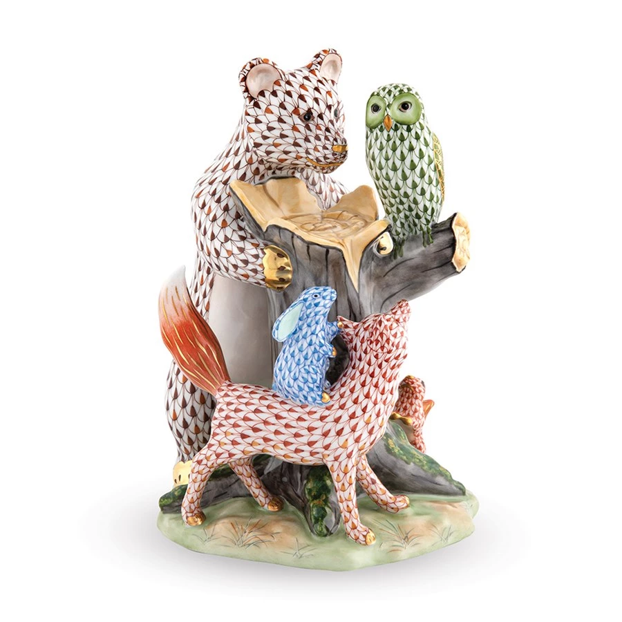 Displaying fine craftsmanship and artisanal taste, the Herend Reserve piece is magical in nature as it is in form. Who knows what wisdom the owl is sharing with his forest friends but clearly the animals have come from far and wide to hear him speak. A bear, rabbit, fox and squirrel gather about, while the central figure of the owl shines in its own right. Add the right amount of mystical magic to your household with this perfect piece, and complete or begin your collection of Herend porcelain, handmade & hand-painted in Hungary with 24k gold accents. Limited edition of 150.