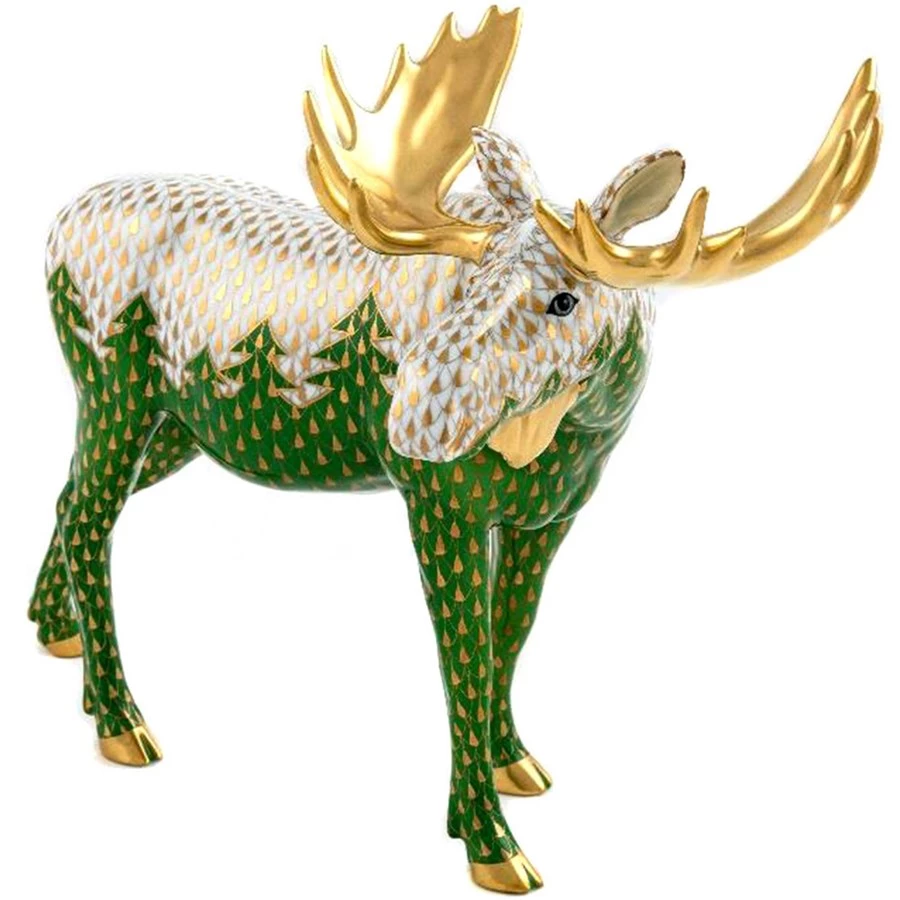 The golden hours of daylight and the majestic scenery of his forest home are reflected in the burnished coat of the Herend Reserve moose. A creative scene within a scene, the artists have rendered a remarkably rich composition for this stately moose using just two fishnet colors. Handmade and handpainted porcelain from Hungary with 24k gold accents. Limited edition of 175.