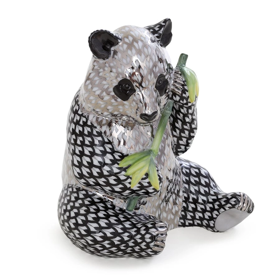 His appearance is iconic and yet mysteries remain about why the panda sports his famous black and white coat. Theories speculate it acts as camouflage for the shade-dappled snow-covered rocky terrain he likes to call home. Oblivious to his popularity, nothing is detracting this panda from eating his favorite treat: bamboo. With drama provided by the platinum and black fishnet of his fur, his eyes provide a soulful counterpoint to create a complex, poignant addition to the Reserve Collection. Limited edition of 150.