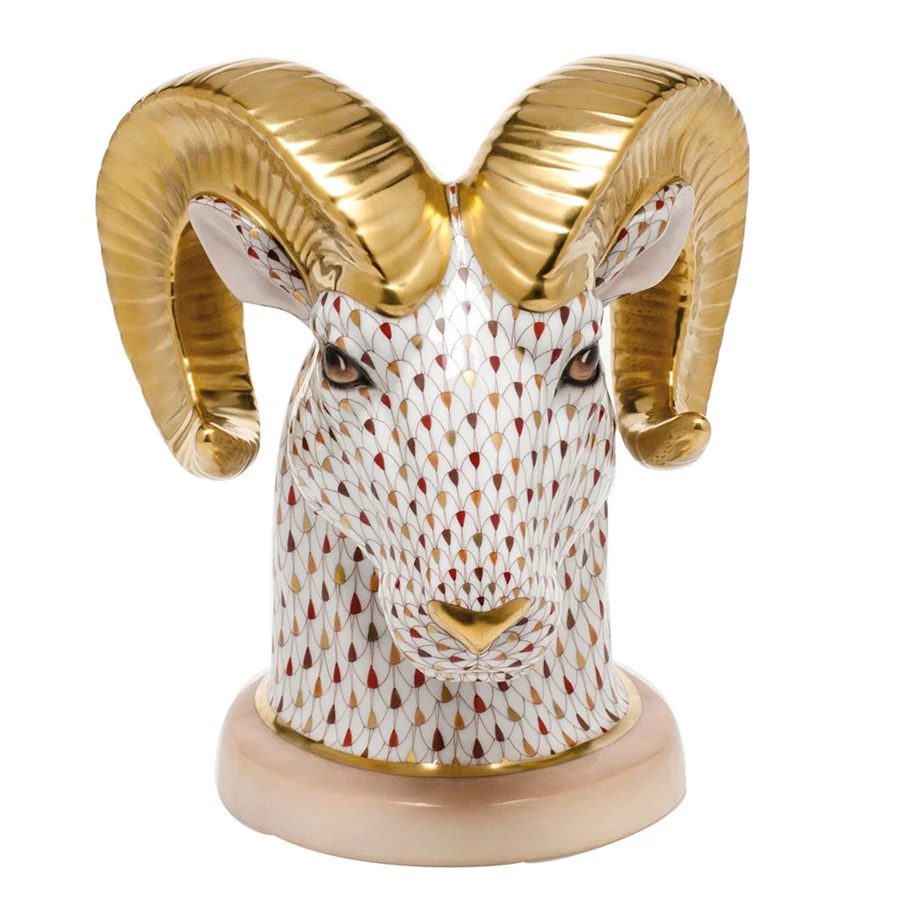 Rams usually need to use the large, curled horns they are famous for to fight for dominance among the other males as well as for the right to pick the girl of their choosing. However, Herend’s newest ram has no such battles ahead since his dramatic gold horns have immediately elevated him to elite status. Cementing his place at the top of the herd are the terracotta, brown and gold fishnet colors woven in an intricate pattern by the talented artists at Herend. Limited edition of 150.
