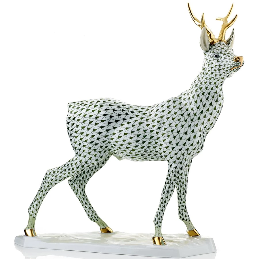 The majestic Roe Buck stands inquisitively, listening for family among the familiar sounds of the forest. The famous fish net pattern adorns her body in the exclusive Forest Green available only at Scully & Scully. Handmade and handpainted porcelain from Hungary, with 24K gold accents. Exclusively at Scully & Scully.