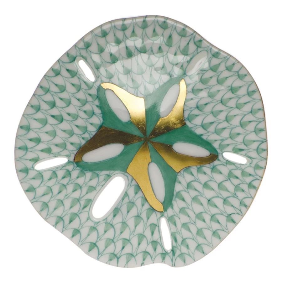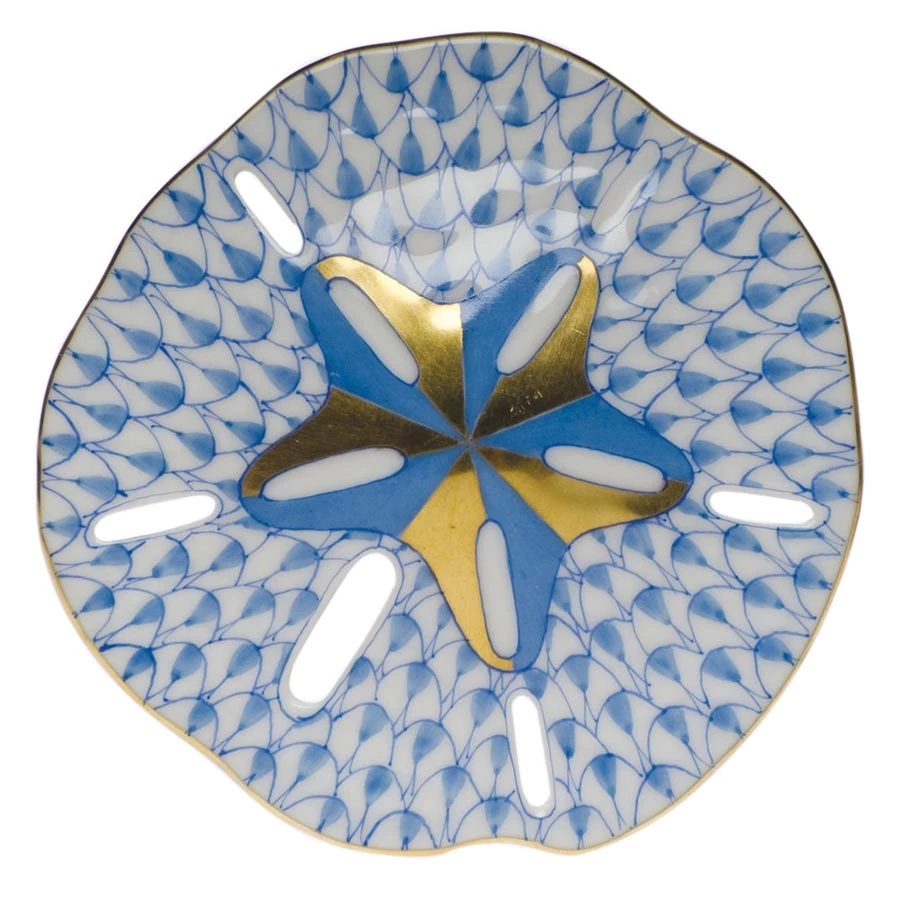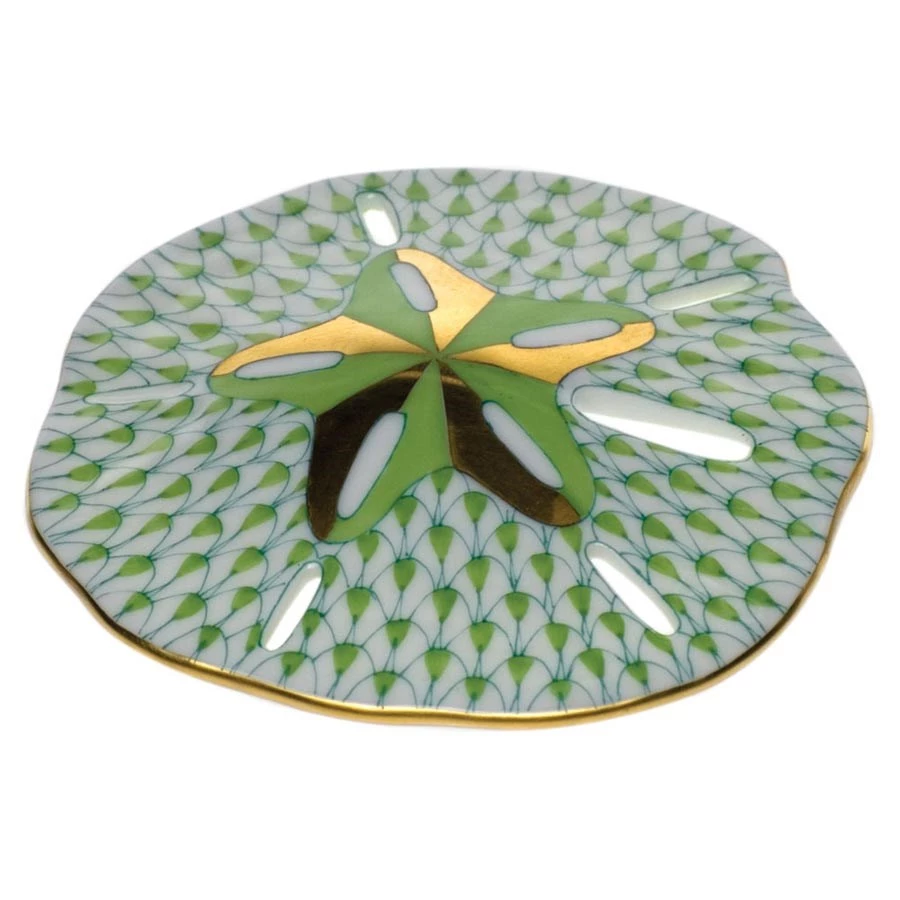 Beautiful sea urchins, with their recognizable five-pointed star detailing, are captured here by the Herend artists as the Sand Dollar. Handmade porcelain from Hungary, handpainted with 24k gold accents.