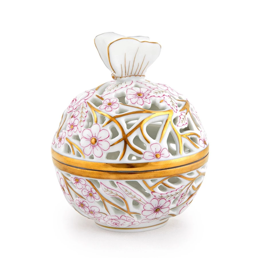 Interlocking porcelain vines create a lovely openwork lattice with a butterfly finial on top. Herend porcelain from Hungary, handmade and handpainted with 24k gold accents.