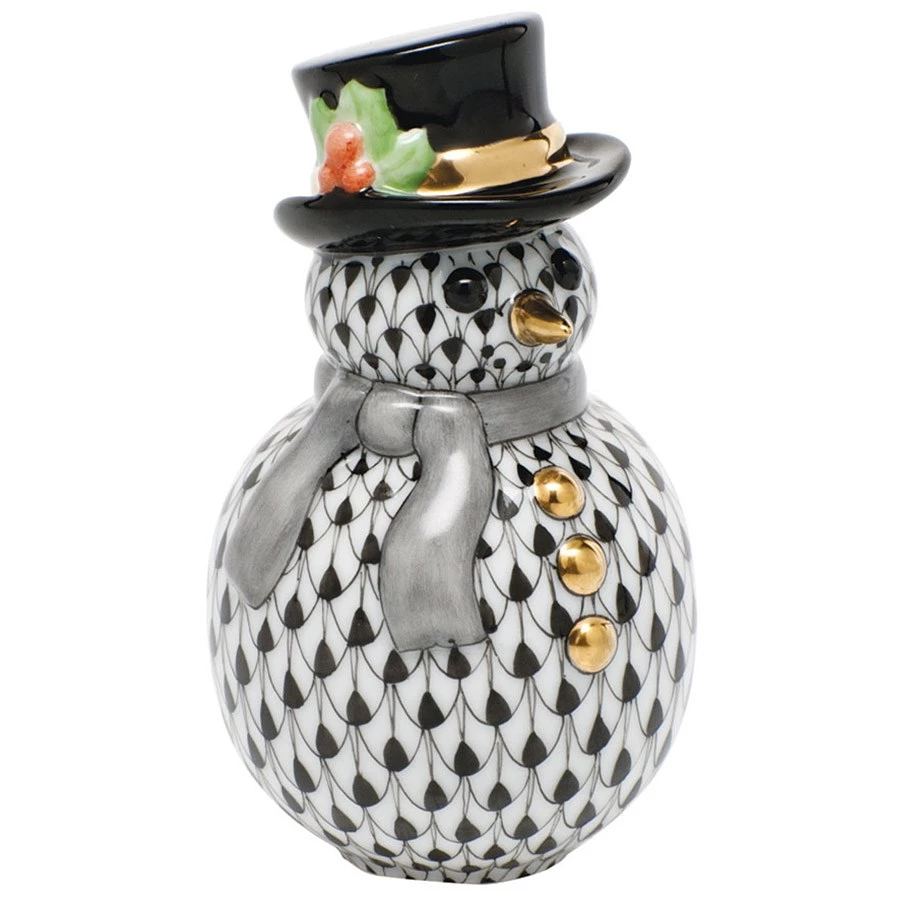 Available in all eight of Herend’s famous fishnet colors (plus one exclusive color!), this delightful little snowman will be a wonderful addition to your collection. Made of handmade and handpainted porcelain from Hungary with 24K gold accents. Holly colors stay the same for all eight fishnet colors. Measures 1½” diameter x 2¾” h.