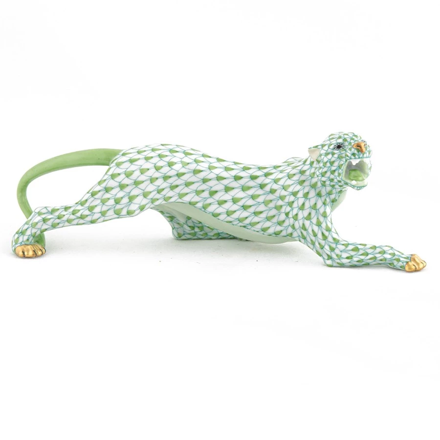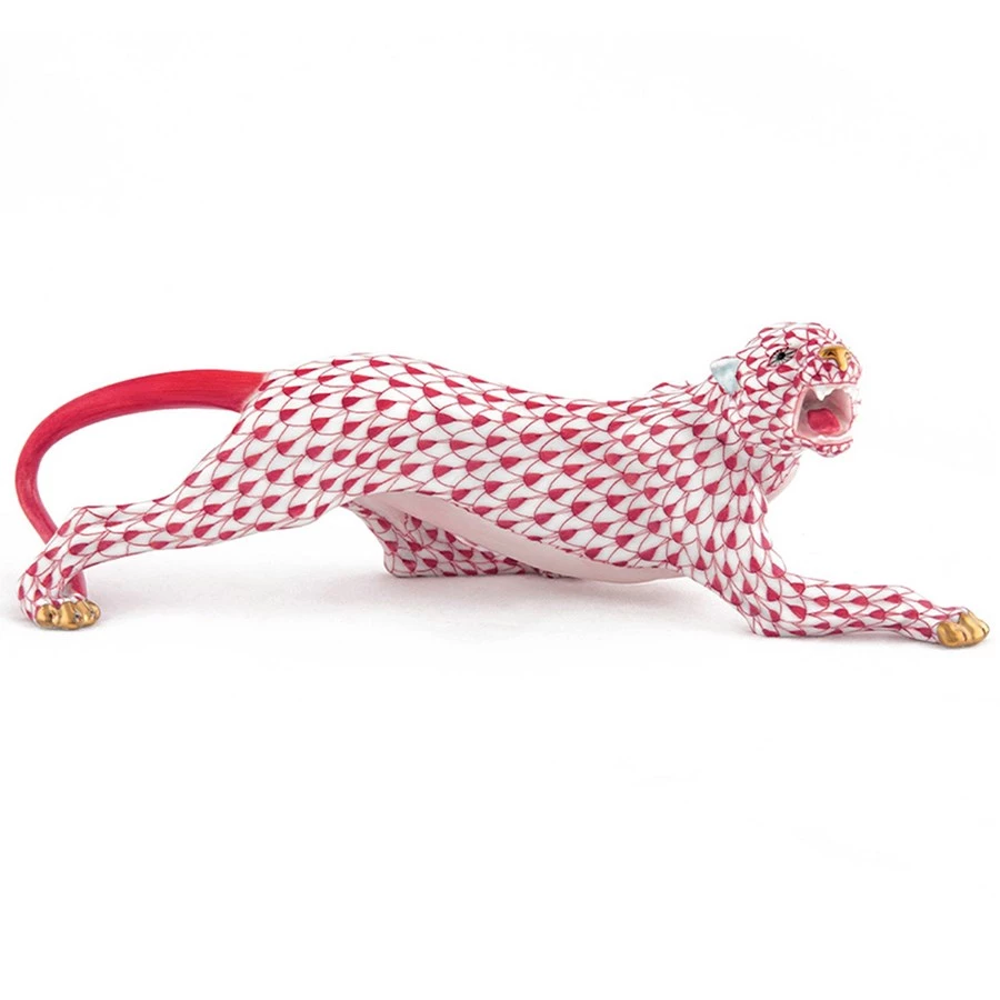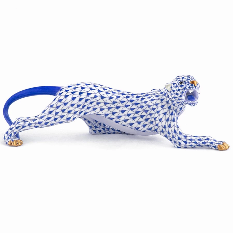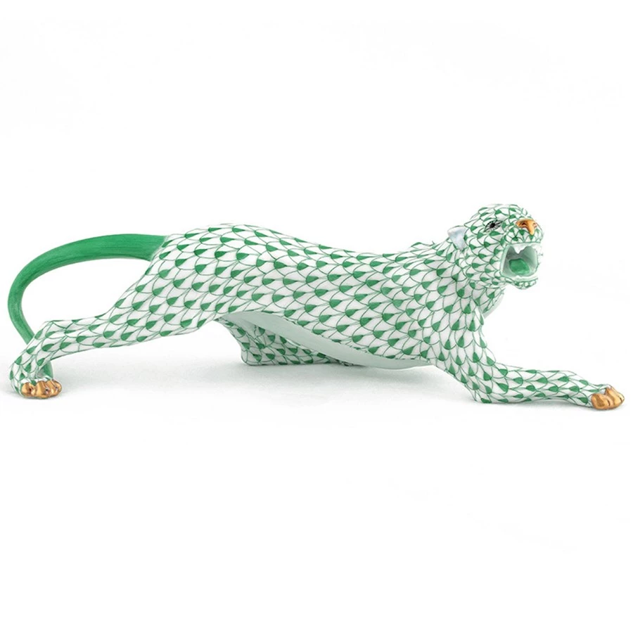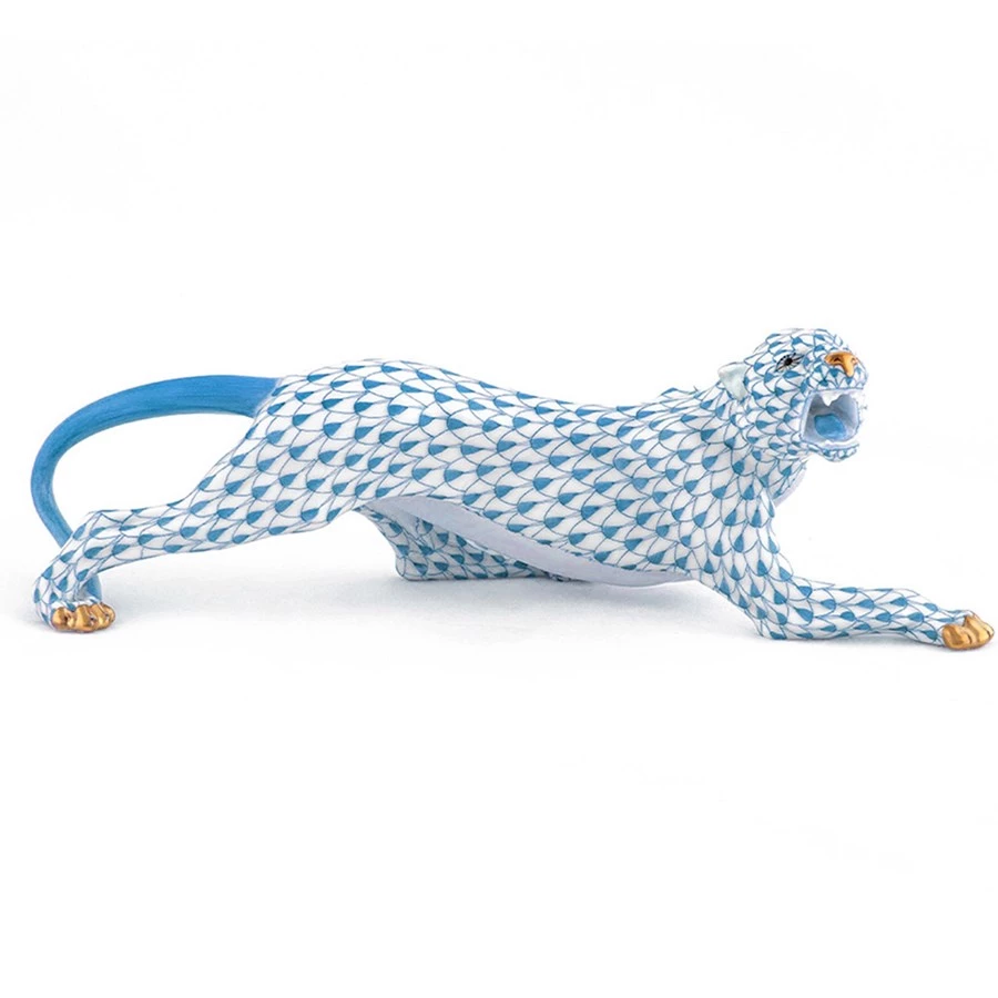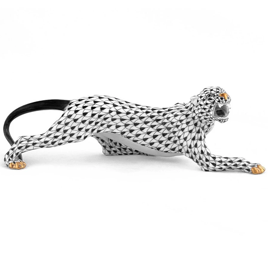 The fearsome Stalking Tiger is given a beautiful finish by the artists at Herend using the famous fish net pattern to create a new kind of camouflage. Handmade and handpainted porcelain from Hungary, with 24k gold accents.