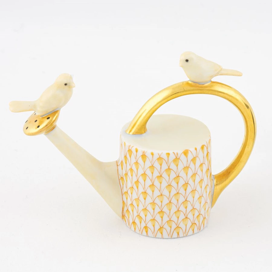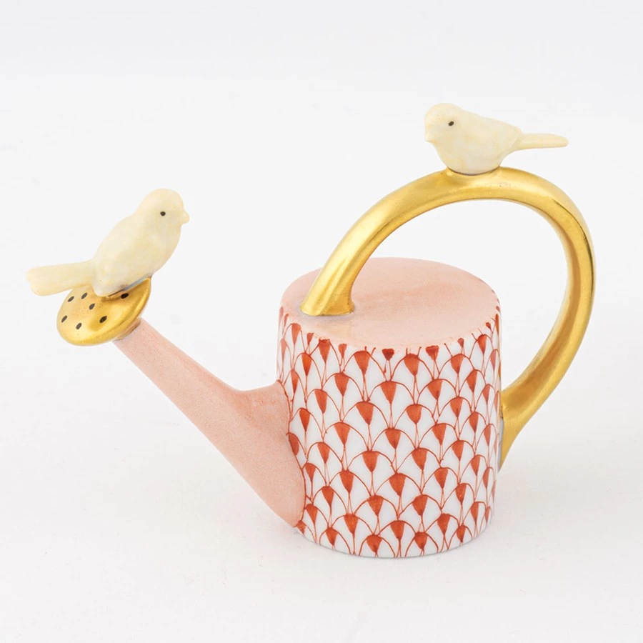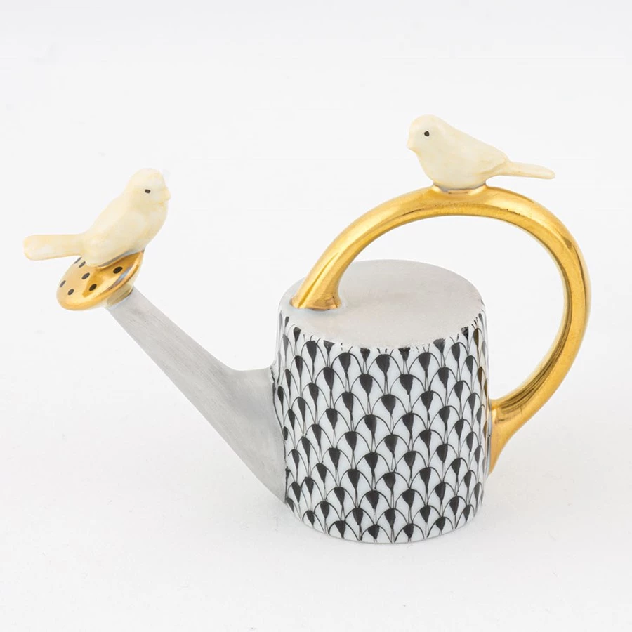 Birds of a feather flock together around this charming watering can from Herend. Handmade porcelain from Hungary, handpainted with 24k gold accents.