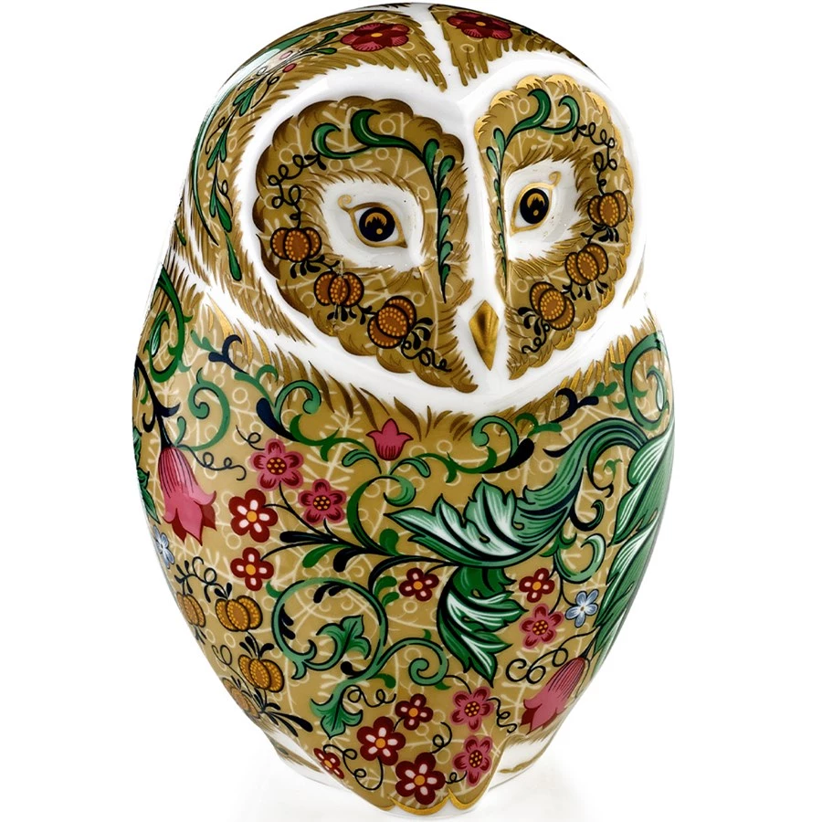 Featuring delicate swirl patterns overlaid with various leaves such as the Acanthus and Tulip flowers, in symmetrical repeats, the bone china Parchment Owl features original designs from William Morris. The pure white bone china is washed with a neutral base color, handpainted with traditional coloring, and then accented with 22k gold. Handmade in England.