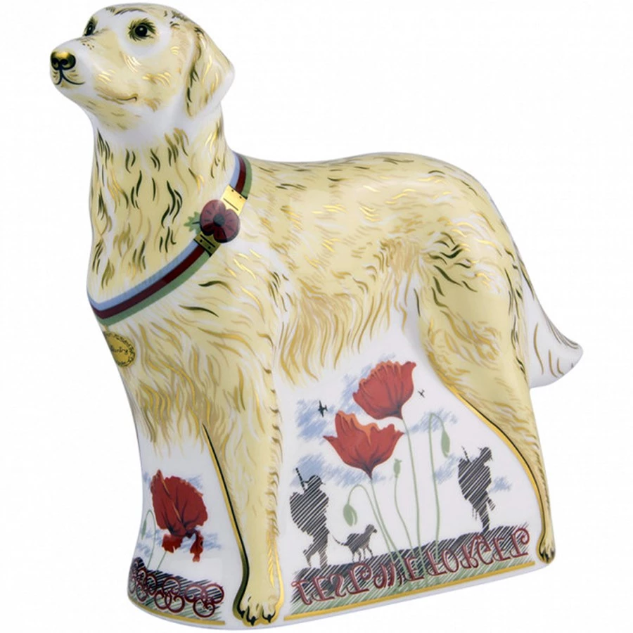 The War Dog is the latest addition to Royal Crown Derby’s commemoration of the service of military animals. Designer Sarah Whitehurst depicts a scene of trench warfare using sketched pencil strokes to create a sense of memory and reflection. The imagery powerfully emphasizes both the physical and psychological impacts of battle, but also the welcomed companionship that war dogs provided. Oversized Flanders field poppies adorn each side of this piece, adding strong scarlet colours whilst symbolizing both healing and remembrance. Inspired by World War II propaganda textiles, Sarah has concealed the words “lest we forget” around the base of the piece, which can be deciphered using a mirrored surface. “Mirror writing” was used on garments during the war allowing citizens to support the troops in another way. This had an immediate effect on the wearer who would be reminded of their patriotic duty, every time they glanced in a mirror. Handmade of bone china in England and accented with 22k gold. Limited edition of 500.