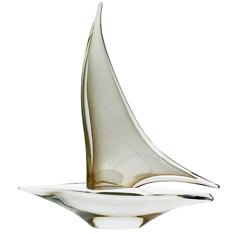 A sailboat glides through the ocean, captured here in pure crystal with a shimmering gold sail. The clear crystal lends the piece the perfect liquid appearance and connects the wave base with the boat in one fluid action. Handmade, mouth-blown crystal from Italy. Exclusively at Scully & Scully.