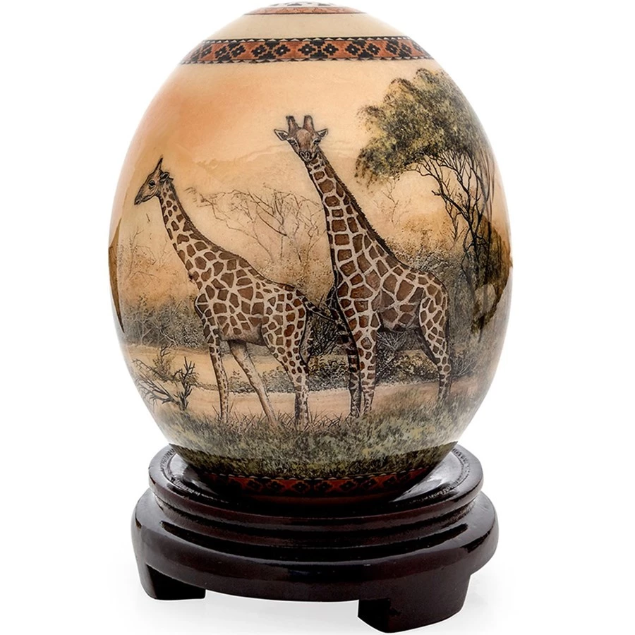 In the tradition of the coveted painted ostrich eggshells of ancient Nubia, these beautiful scenes are reproduced from paintings by African and international artists. The wonderful coloration comes from approximately fifty layers of lacquer. Only unfertilized emptied shells are used; each is unique in size and shape. Wooden stand is included.Â