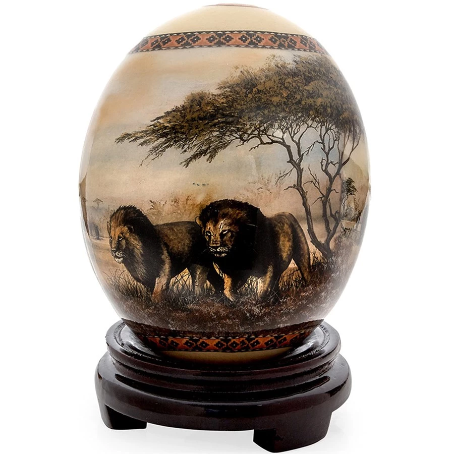 In the tradition of the coveted painted ostrich eggshells of ancient Nubia, these beautiful scenes are reproduced from paintings by African and international artists. The wonderful coloration comes from approximately fifty layers of lacquer. Only unfertilized emptied shells are used; each is unique in size and shape. Exclusively at Scully & Scully. Wooden stand is included.Â