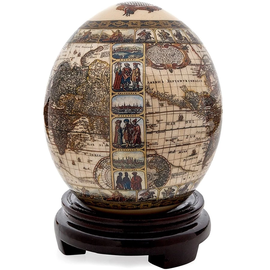 In the tradition of the coveted painted ostrich eggshells of ancient Nubia, these beautiful scenes are reproduced from paintings by African and international artists. The wonderful coloration comes from approximately fifty layers of lacquer. Only unfertilized emptied shells are used; each is unique in size and shape. Wooden stand is included.Â