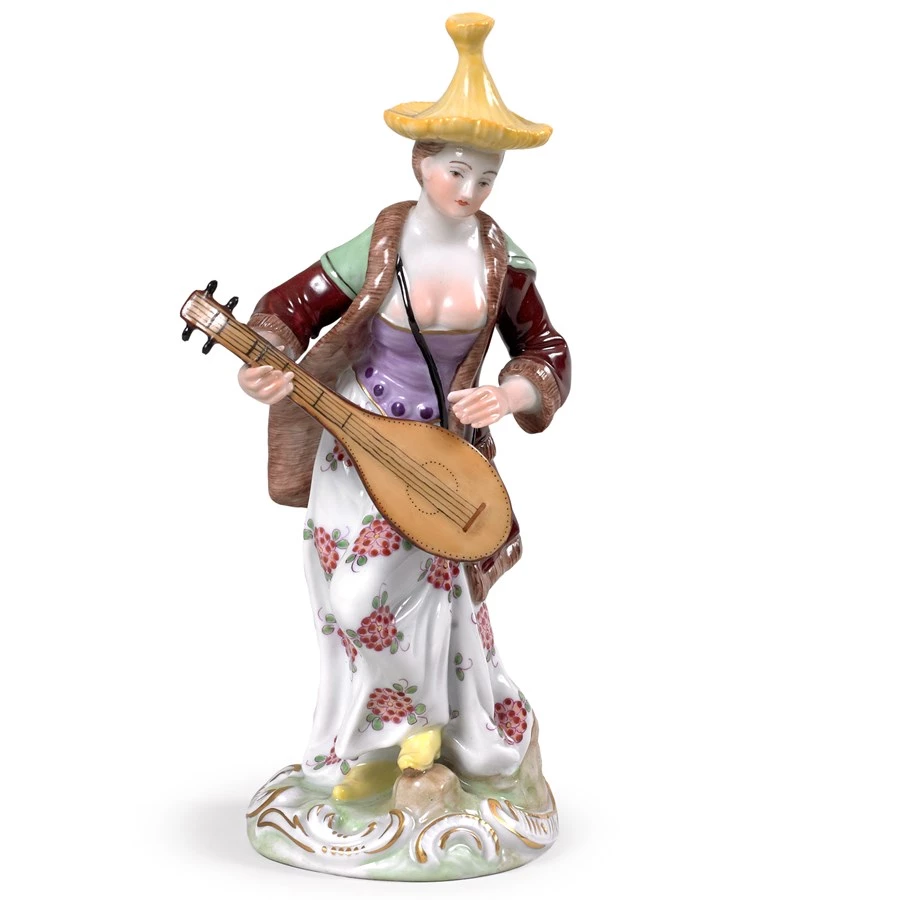 Lyrical, colorful, handpainted in fine detail, this Dresden porcelain couple will fill your heart with song. The style and grace of these figures reflect the 18th century European fascination with everything Chinese. Handmade in Germany exclusively for us.