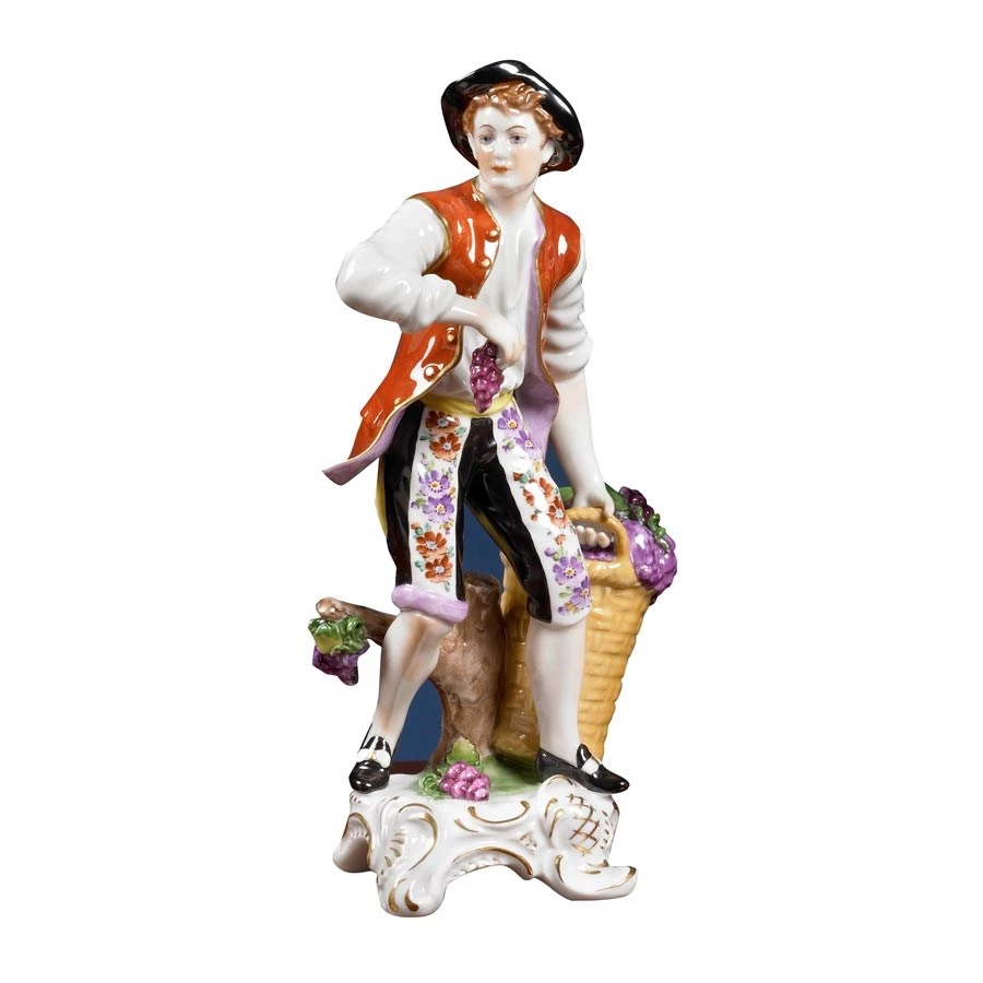 Bright colors and sprightly poses on handmade and handpainted porcelain figurines. Note the minute details on the costumes and the gold trim on the bases. Each is signed by the artist. Handmade in Germany. Exclusively at Scully & Scully.