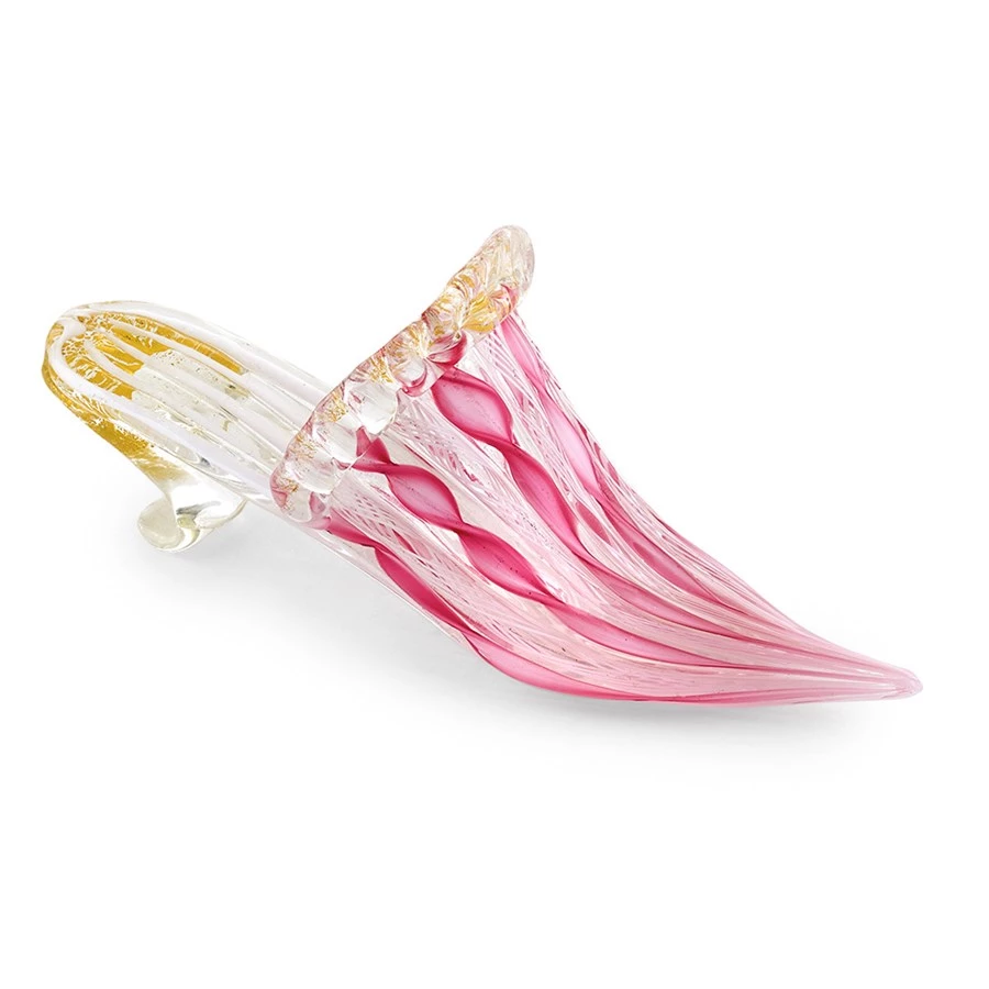 Fabulously handcrafted glass slippers from the fabled Isle of Murano in Venice. Since 1291, glassmakers have created iconic wares such as these shoes. Each enchanting shoe is crafted with mouthblown and handcut glass, lined with 24K gold. A fairytale symbol of storied Venice. Because each piece is made by hand, no two are exactly alike. Handmade in Murano, Italy.