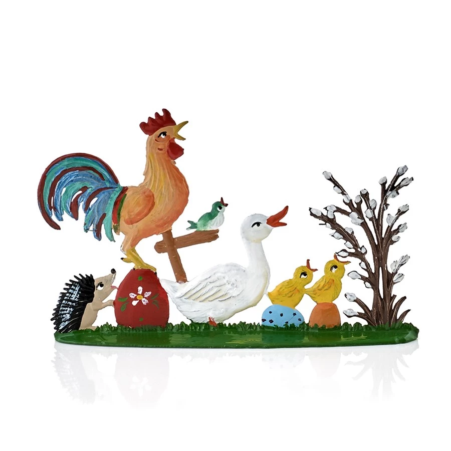 Five friendly birds sing the dawn chorus with three easter eggs, accompanied by their friendly hedgehog pal. Entirely handmade by one family in Germany since 1796. Each piece is handcast in slate engraved molds, then handpainted on both sides so it can face either way. Because each piece is handpainted by an individual artist who mixes their own paints, colors may vary from those examples shown.