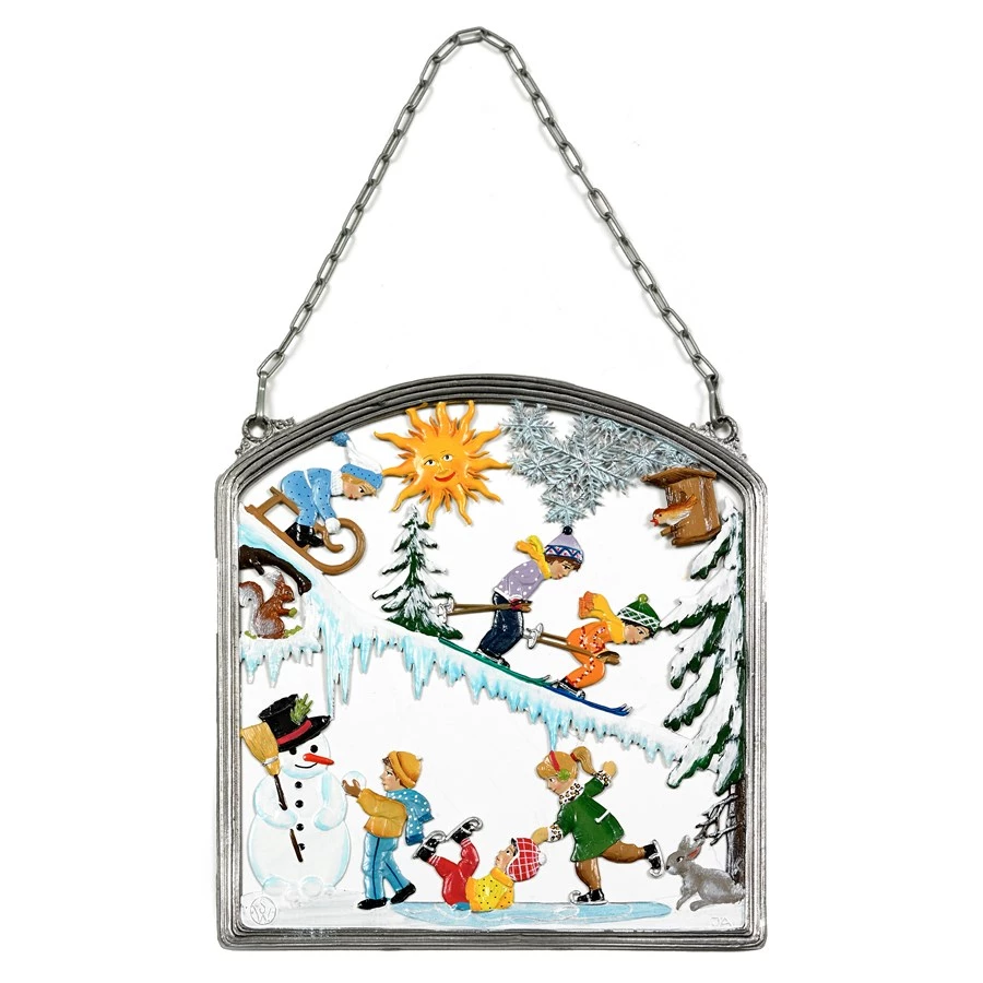 Pewter Winter Fun Wall Hanging captures a wonderful Christmas time. This can also be used as a tree ornament. Painted on one side only. Entirely handmade by one family in Germany since 1796, this Christmas figurine is handcast in slate engraved molds then handpainted.
